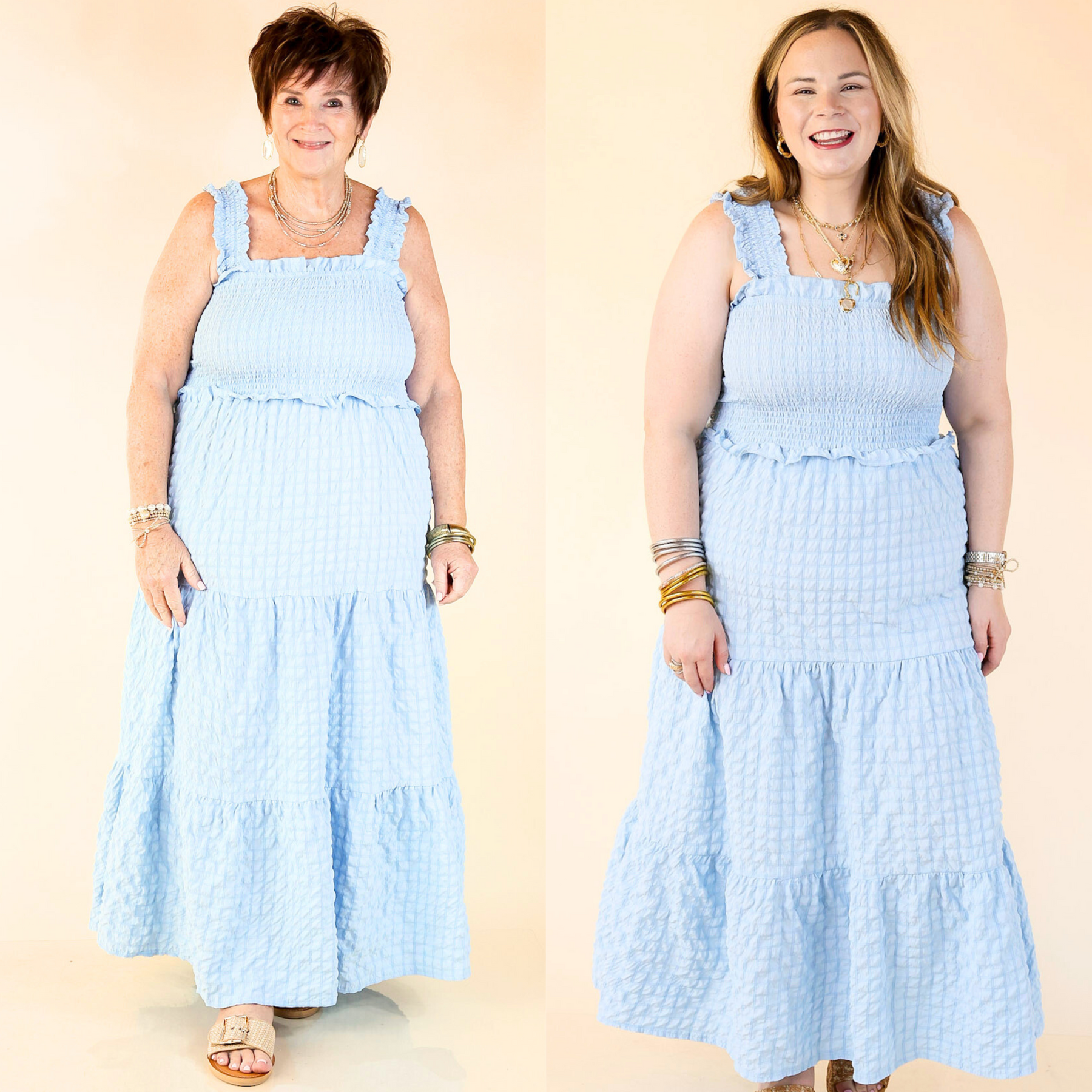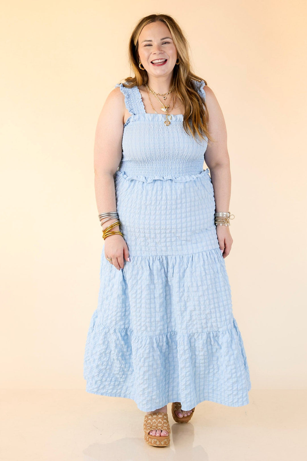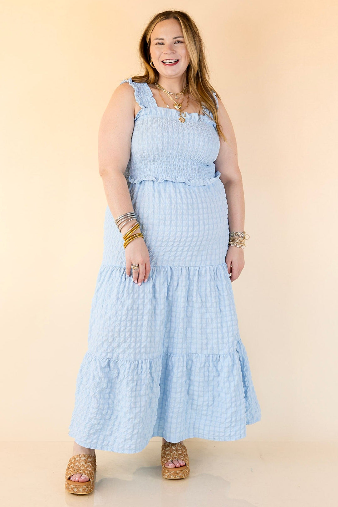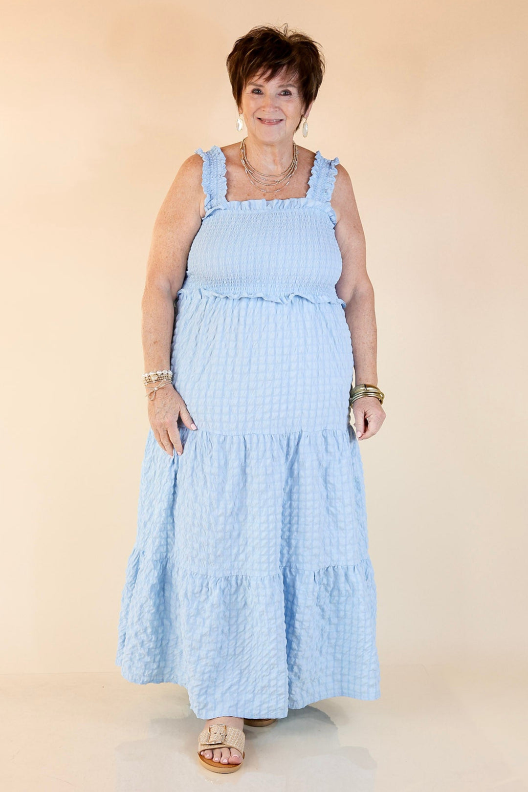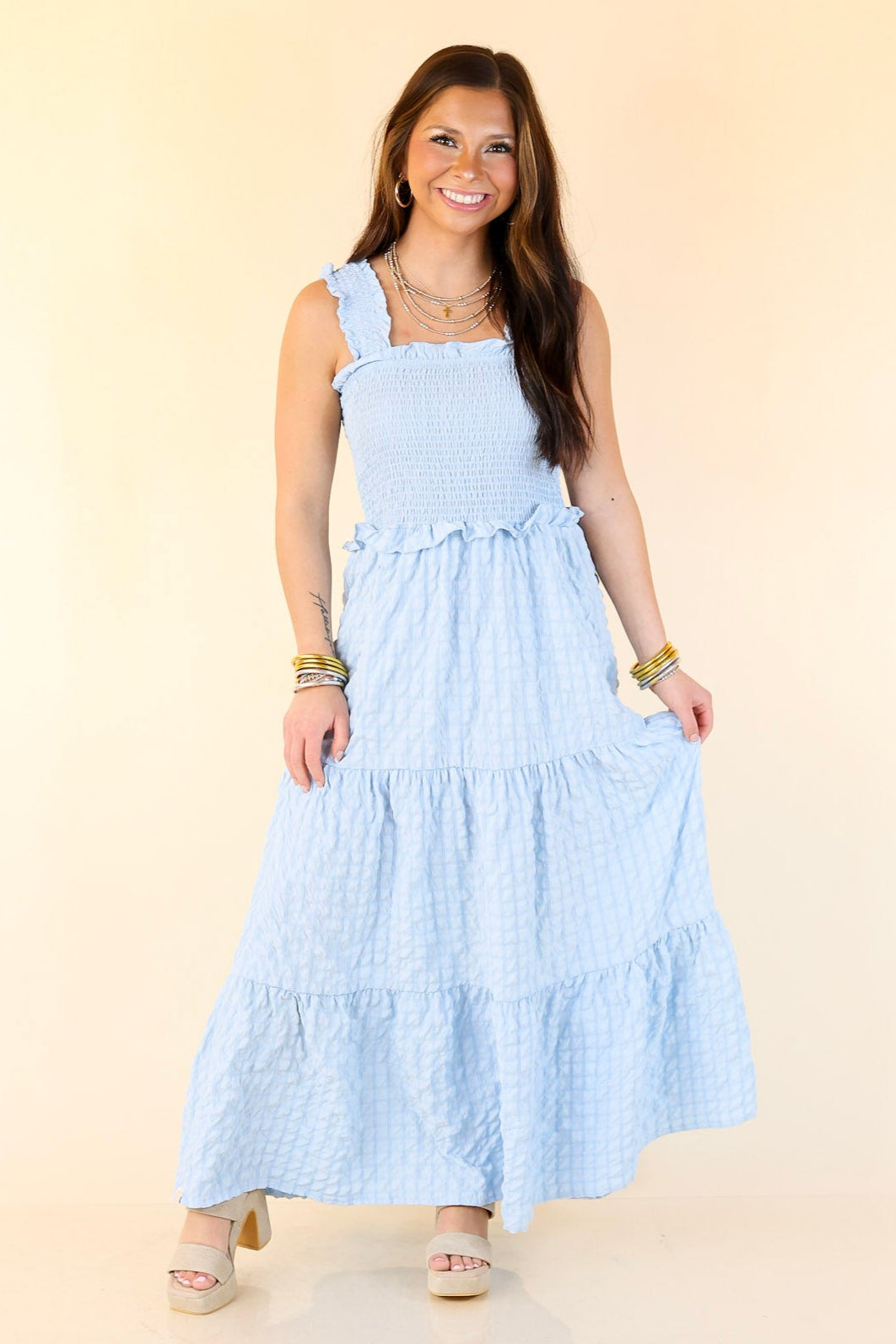 Pretty, polished, and ready for sunshine. The Summer Muse Maxi Dress is a classic sundress with a fresh twist—featuring a Sky Blue plaid print and softly ruched fabric that adds just the right amount of texture. The smocked bodice offers a flattering, flexible fit while the full-length flowy skirt keeps things breezy and timeless. Whether you're headed to a picnic, a patio dinner, or just soaking up the sun, this dress is pure summer charm in motion.