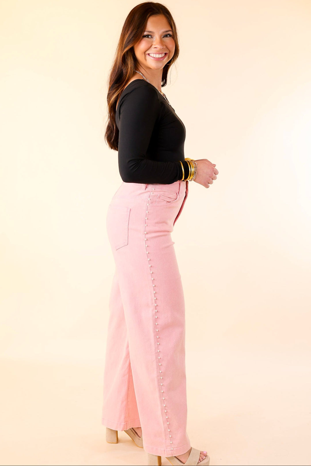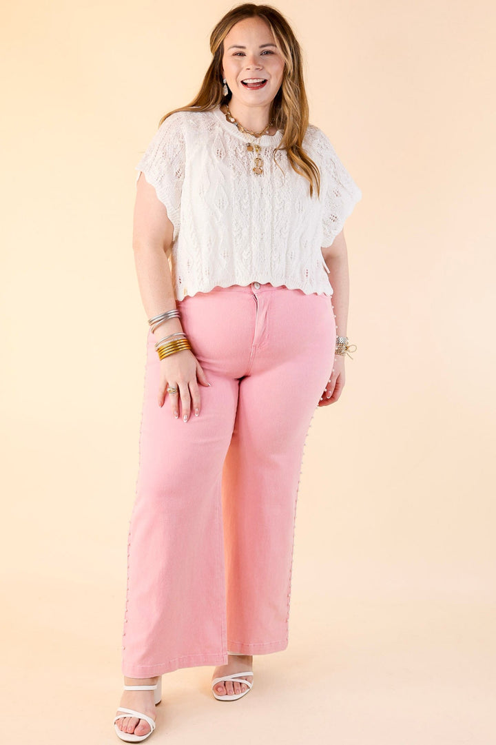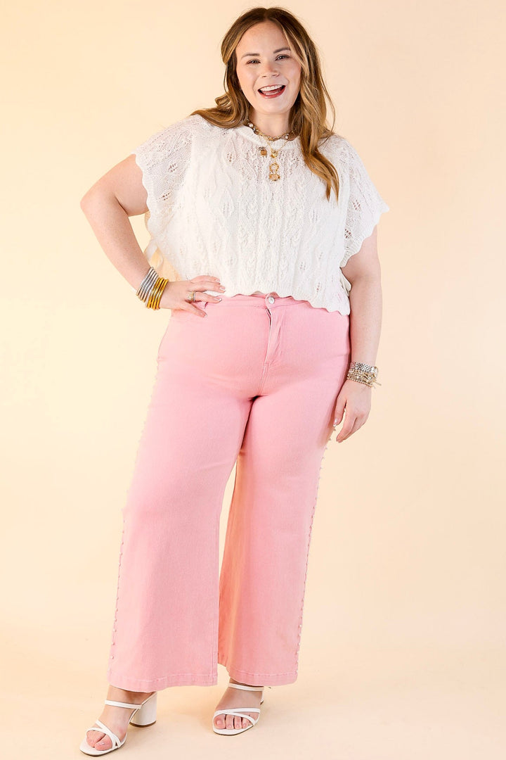 Sunny Stroll Cropped Wide Leg Jean with Pearls in Pink