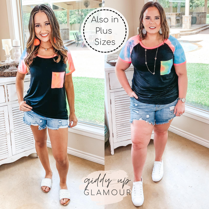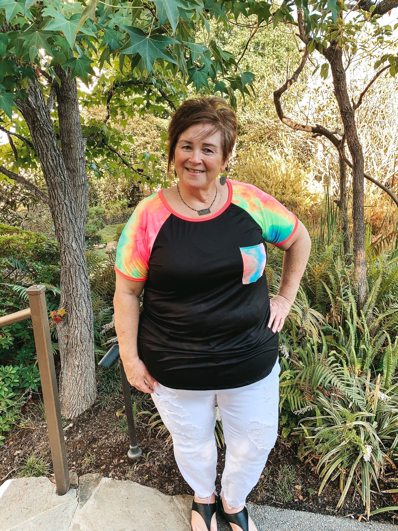You will have sunshine beaming from all over when you wear this fun tee! The tie dye sleeves and pocket on the black top give this a bright and happy look! Perfect for all occasions, this top will give you so much comfort and style! Lily is wearing a size small. Abby is wearing a size large.
