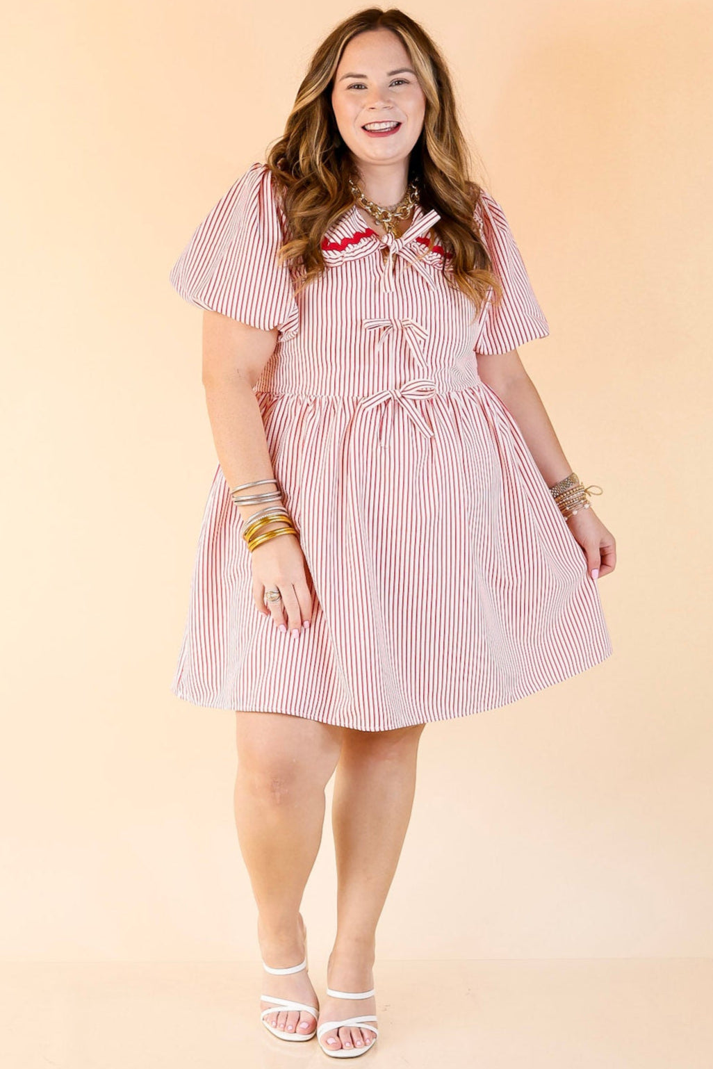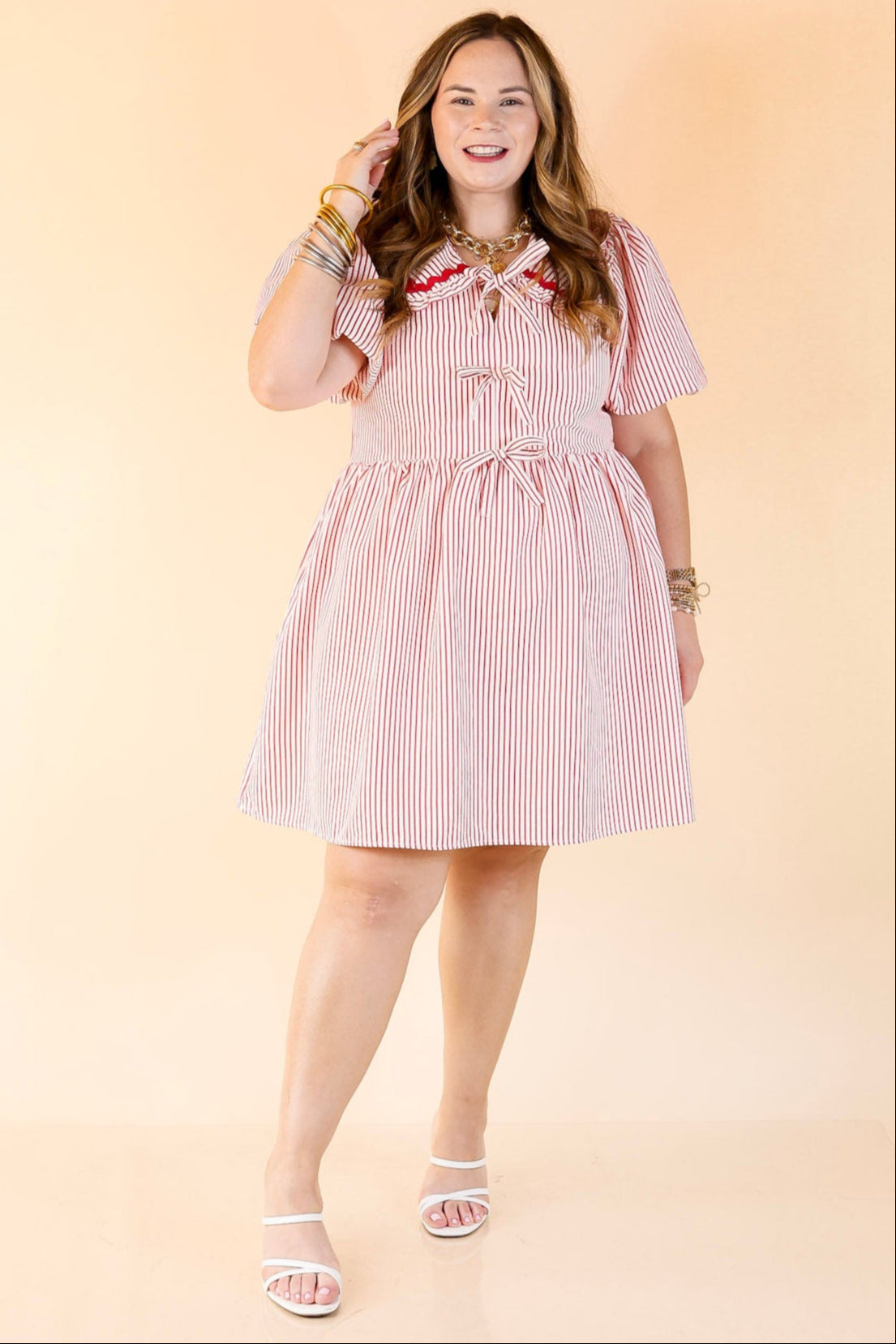 Make a playful impression in the Sweet Statement dress. This red and white striped babydoll dress features short puff sleeves, a relaxed fit, and charming details that set it apart—like three dainty bows down the front and a classic Peter Pan collar trimmed with rickrack. Feminine, fun, and full of personality, this dress is perfect for summer outings, brunch dates, or any moment when you want your outfit to do the talking.
