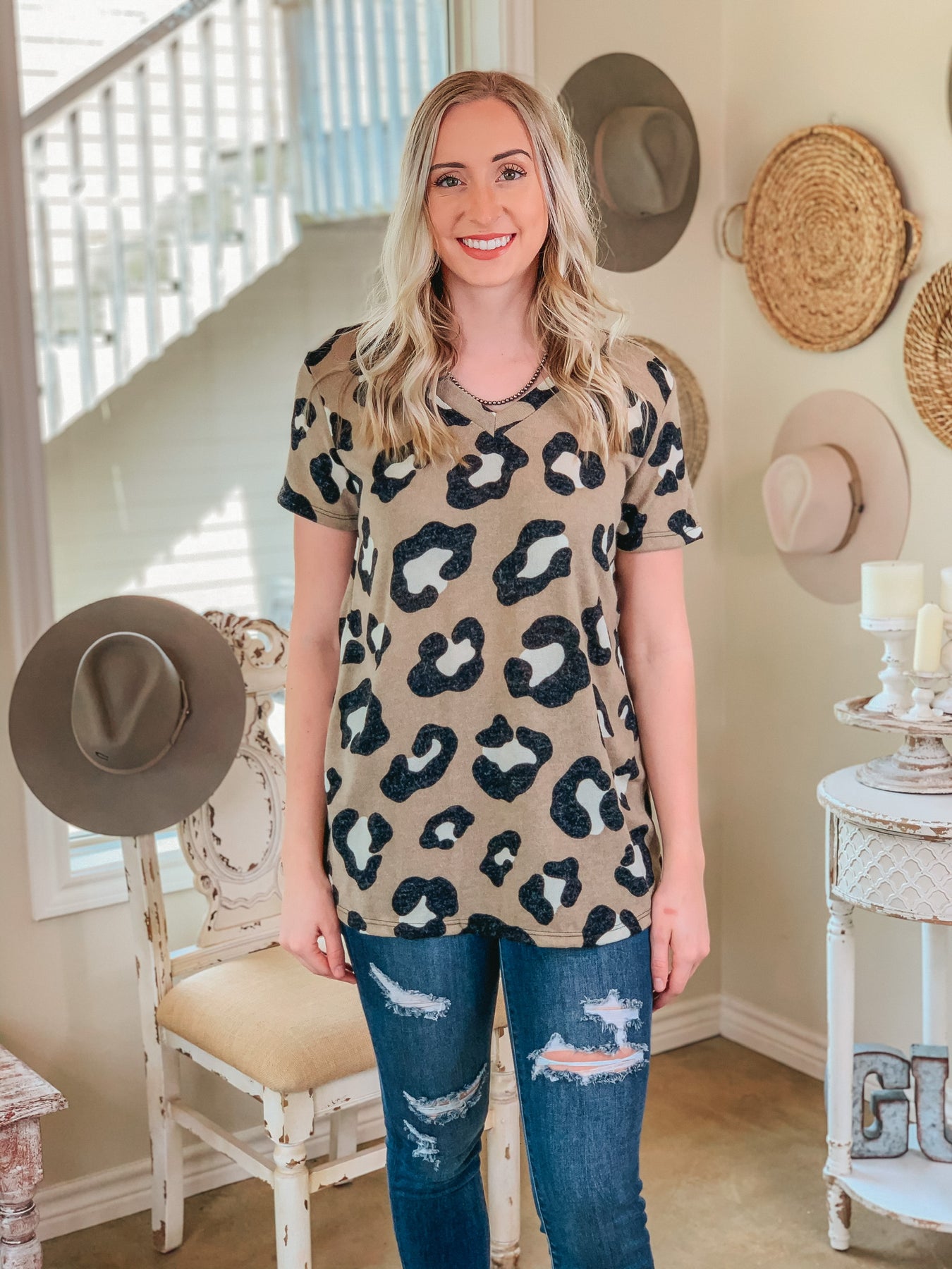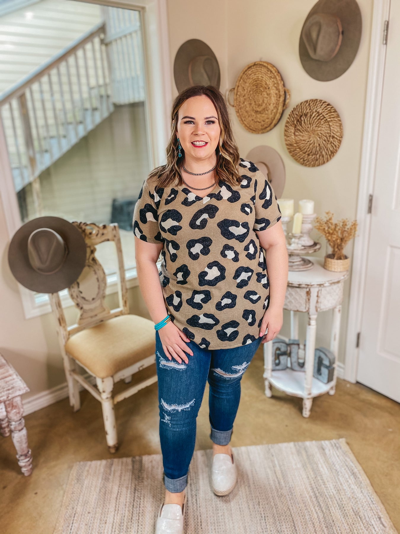 It's that simple to look so good! These cute tops are the key to effortless style! This v-neck tee has short sleeves, a slightly over sized fit, and an adorable leopard print! Pair it with your favorite trousers or a pair of cut offs! Josie is 5'8" and is wearing a small. Abby is wearing a size XL.