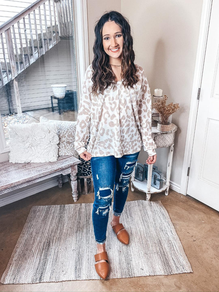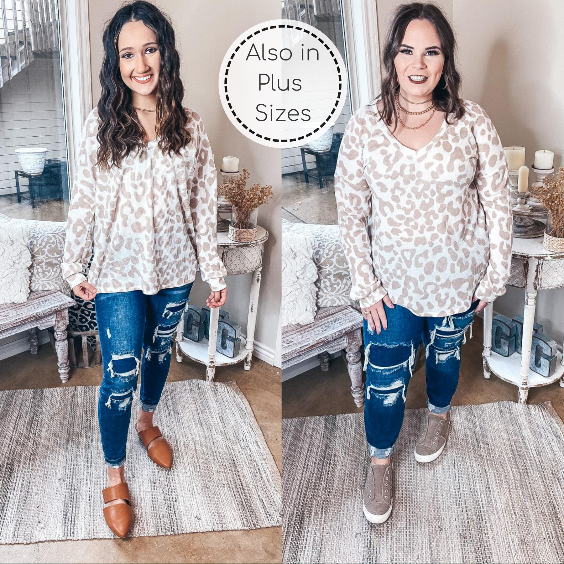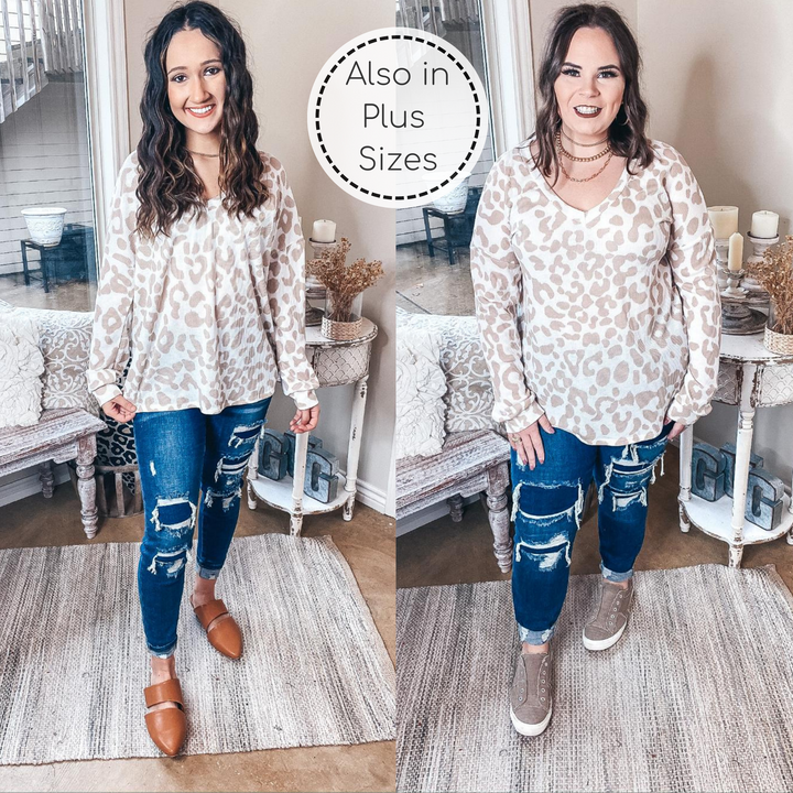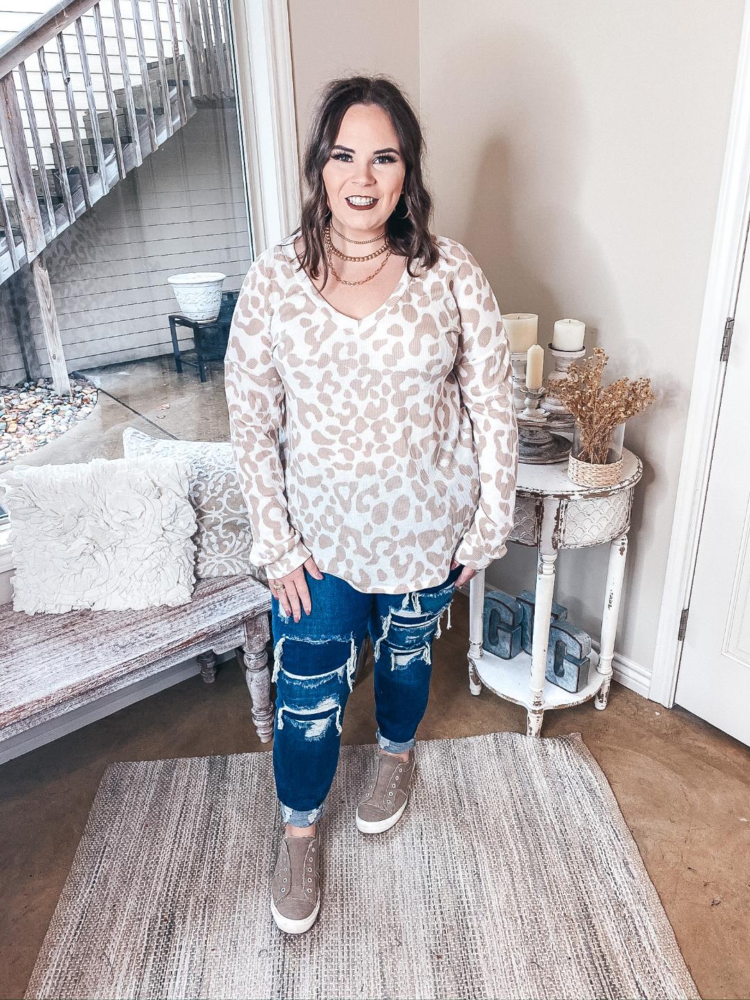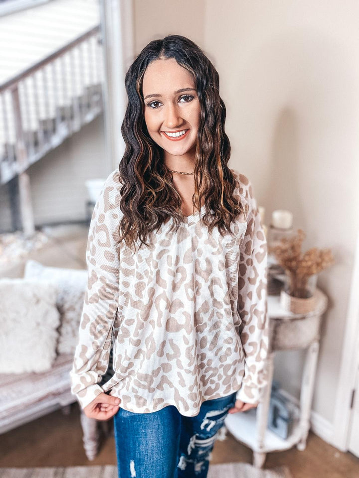 Last Chance Size Small & 2XL | See Ya Soon Leopard Long Sleeve V Neck Waffle Knit Top in Taupe