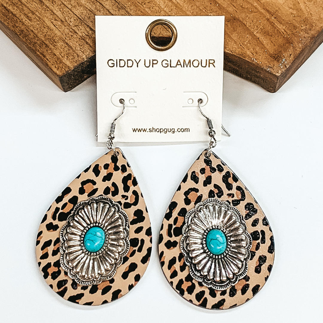 Teardrop Earrings with Silver Concho and Center Turquoise Stone in Cheetah Print