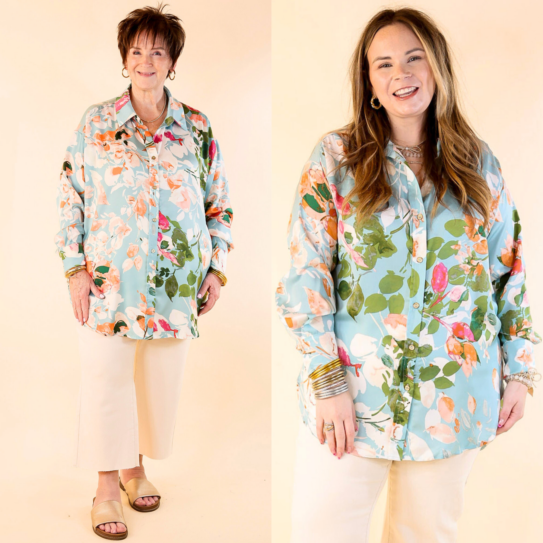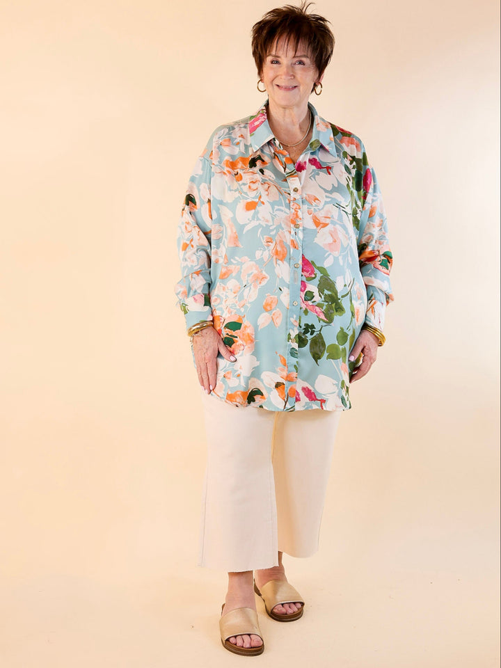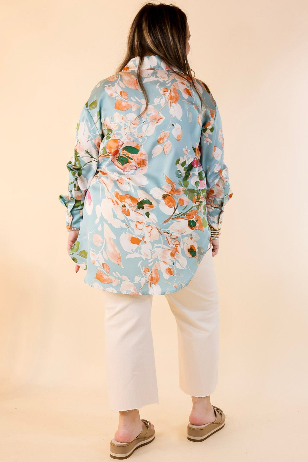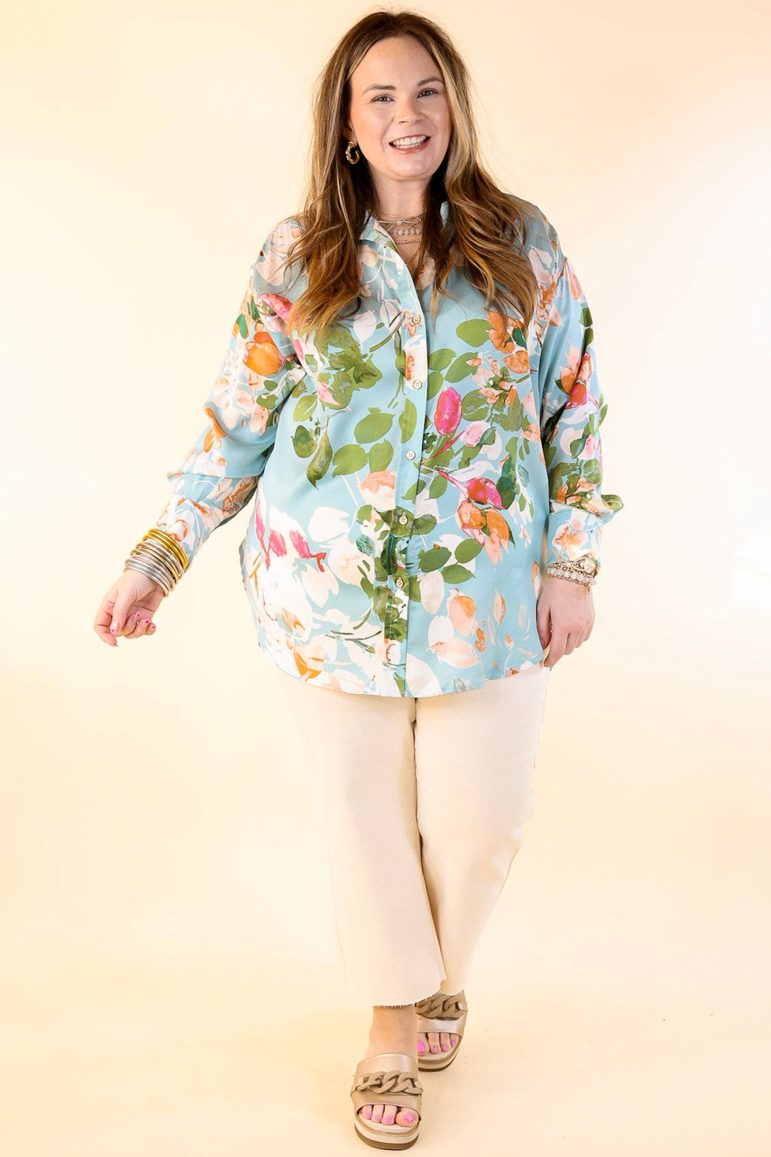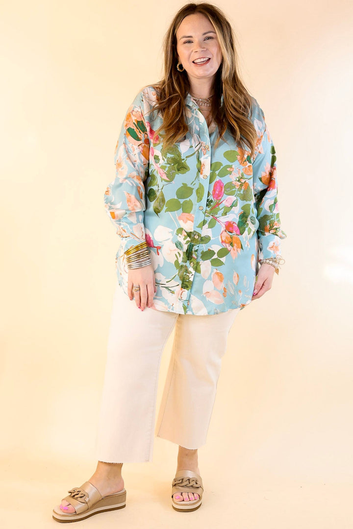 Tell Me Something Good Floral Long Sleeve Button Up Top in Light Blue