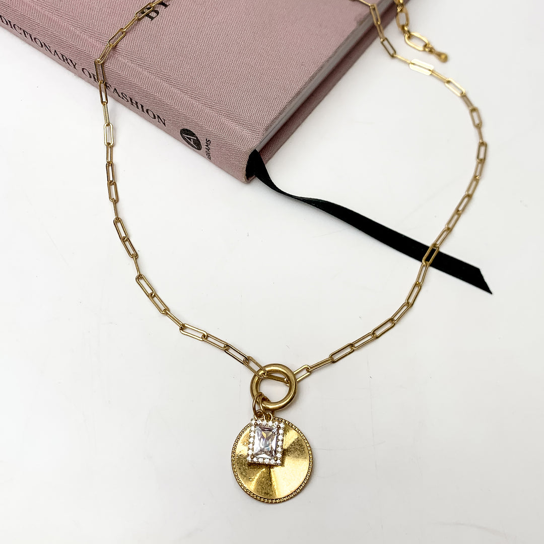 Gold tone chain necklace with circle pendant and clear crystal charm. This necklace is pictured on a white background with part of it on a pink book.