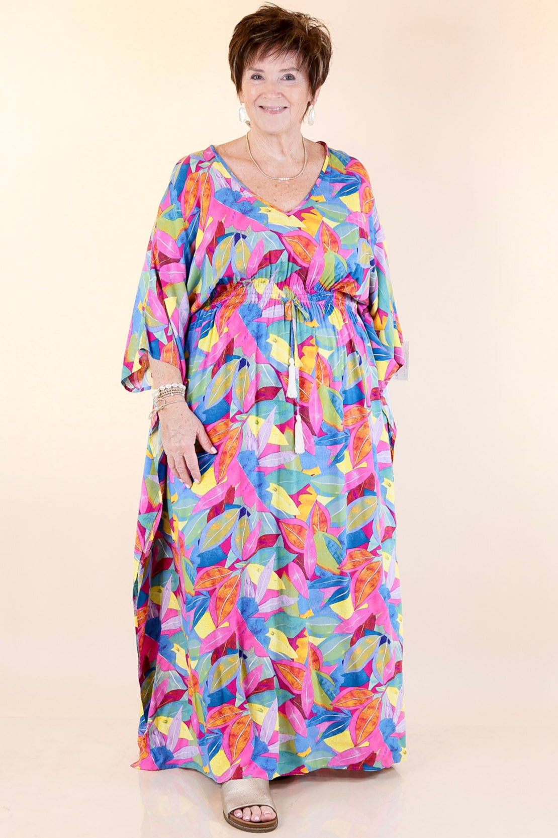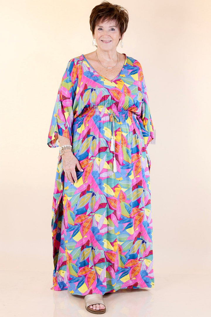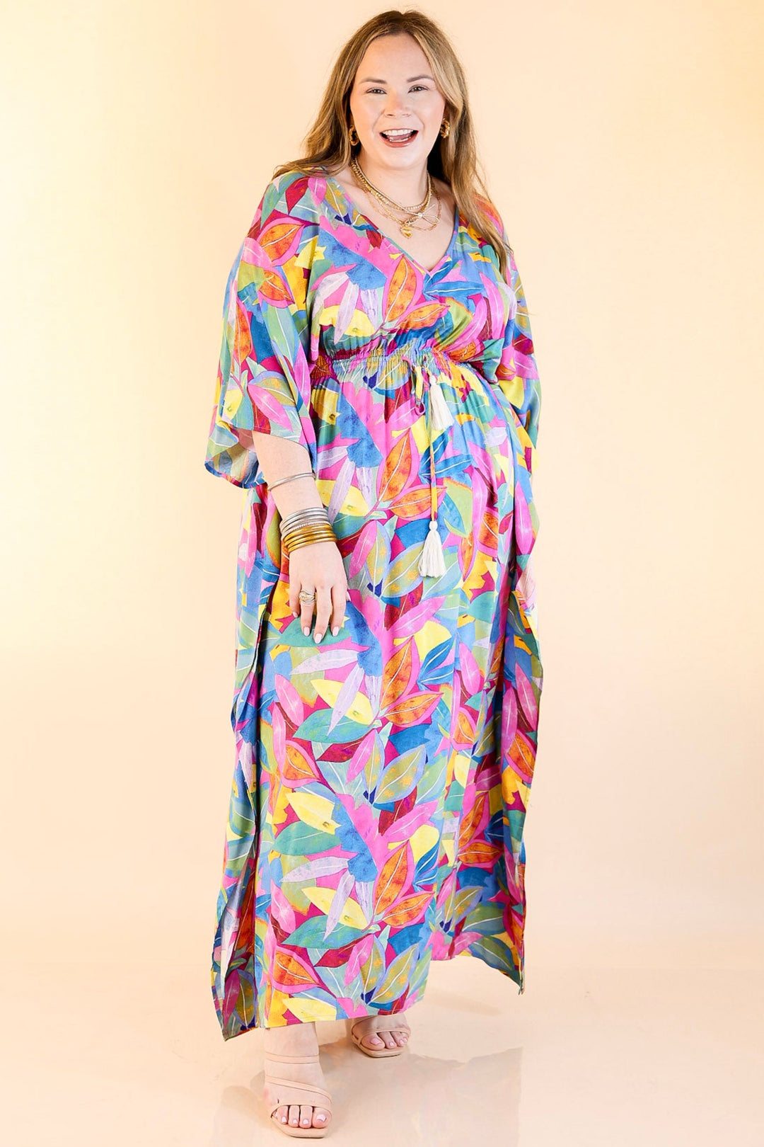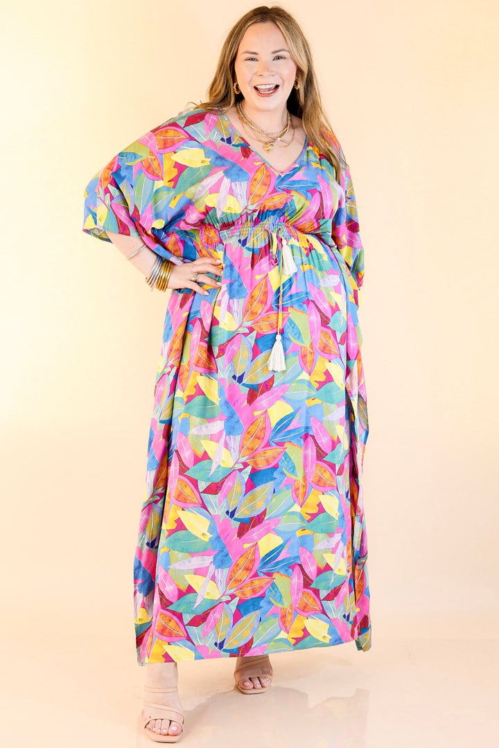 This perfect day dress is sure to make a statement. Made with a flowy maxi silhouette featuring a vibrant multicolor leaf print and a tie waist for an adjustable fit. With half sleeve and tassel detailing, this magenta multi dress is sure to transform your wardrobe. Dress is lined.