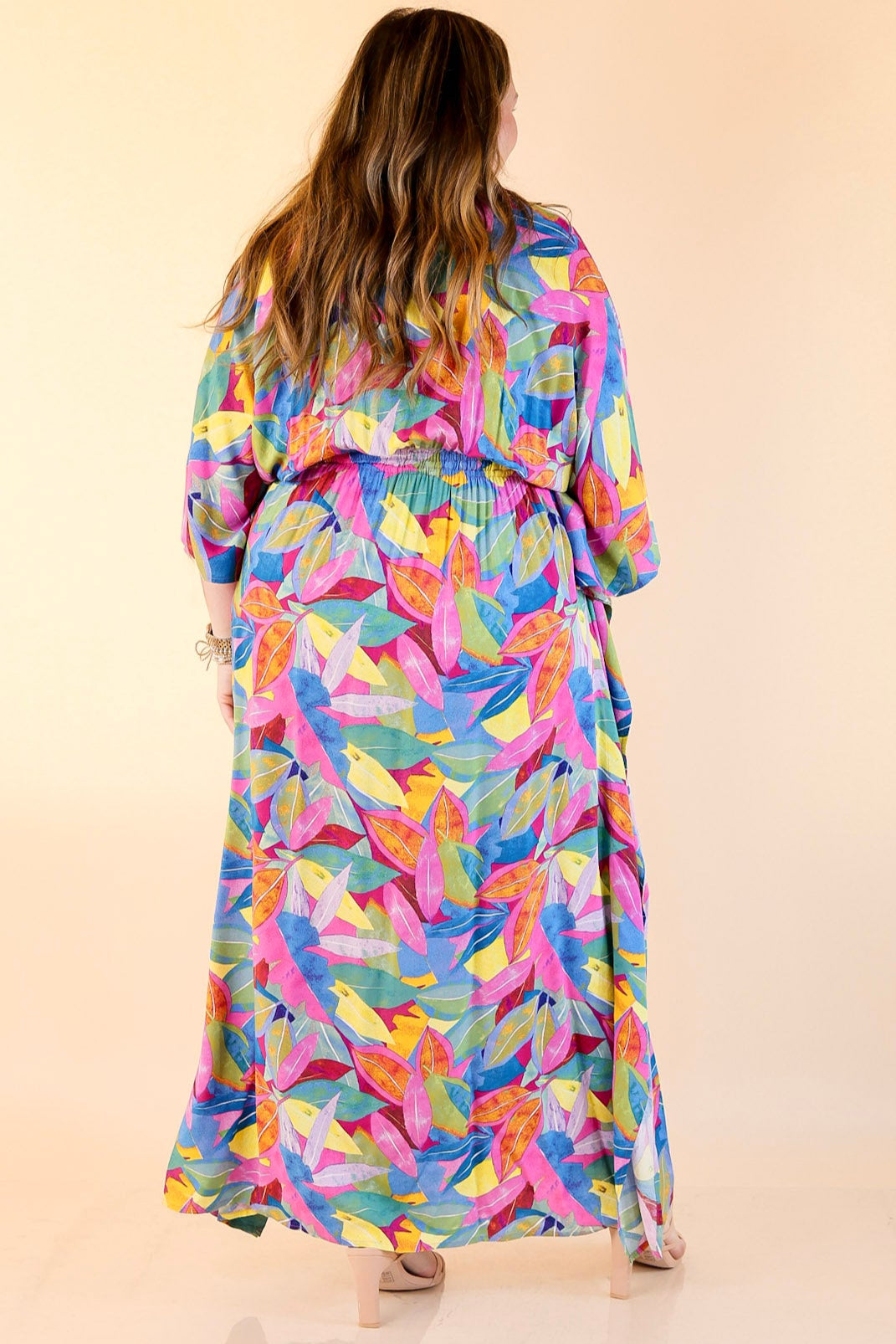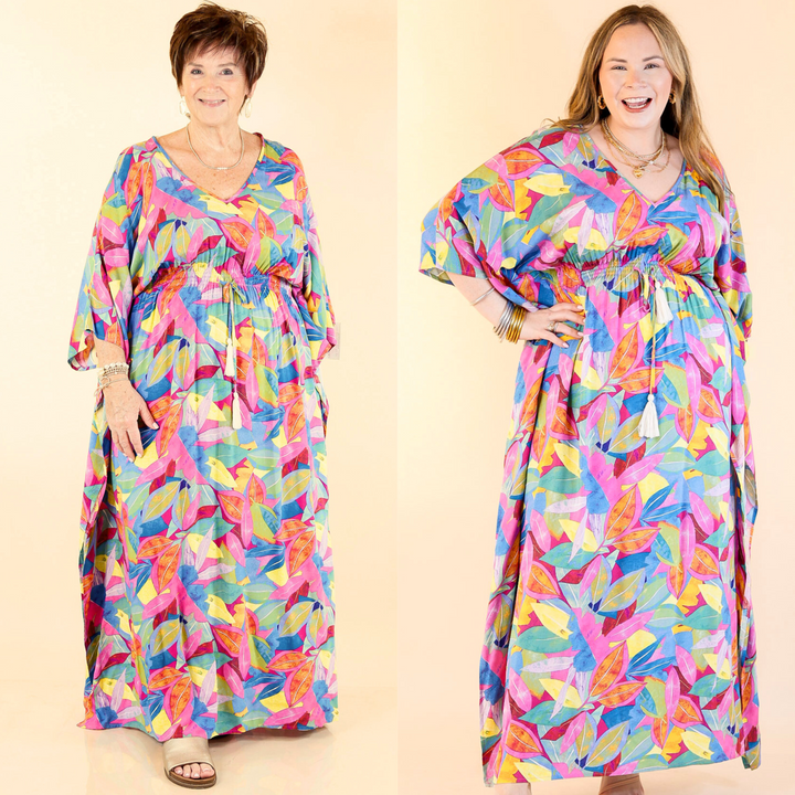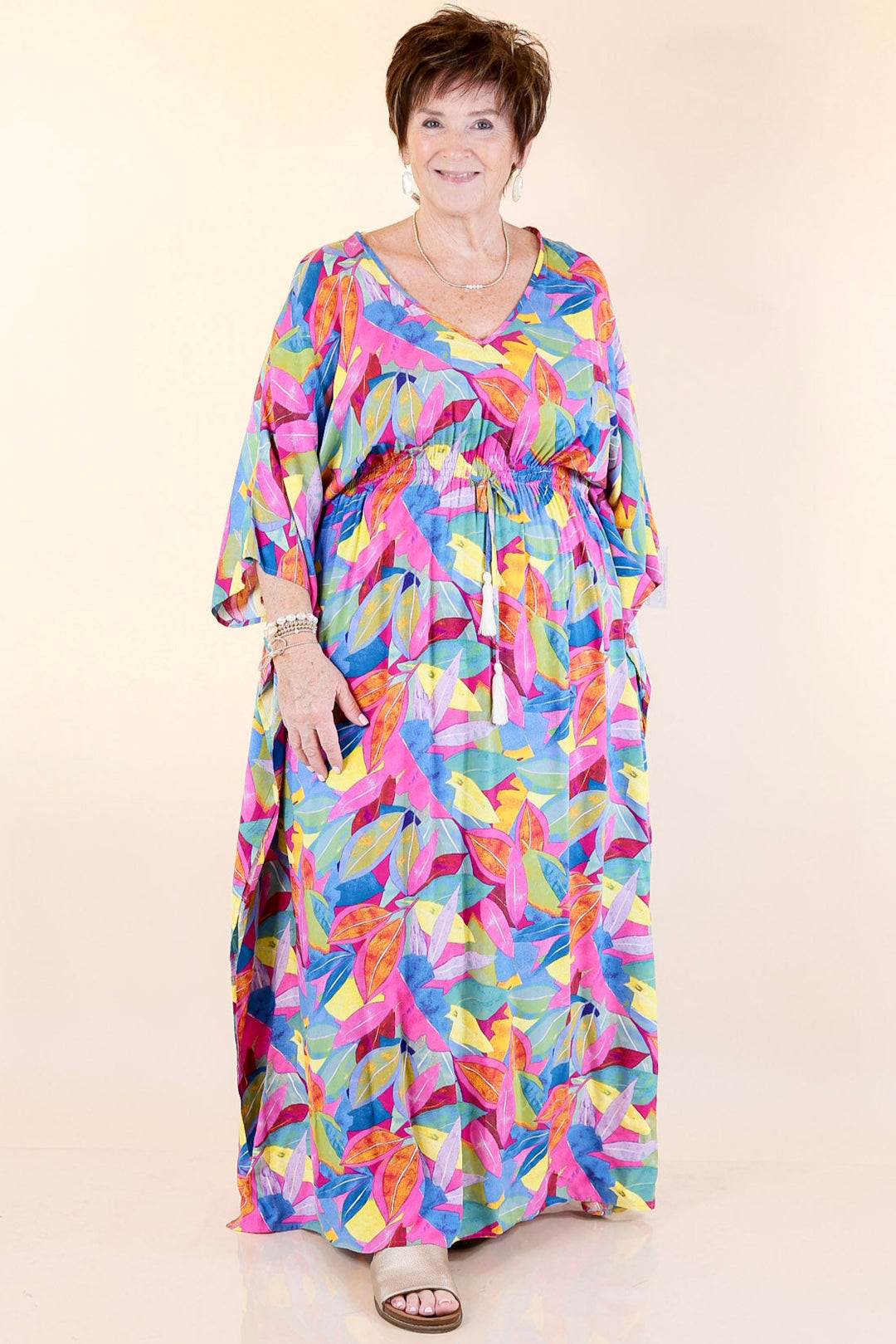 This perfect day dress is sure to make a statement. Made with a flowy maxi silhouette featuring a vibrant multicolor leaf print and a tie waist for an adjustable fit. With half sleeve and tassel detailing, this magenta multi dress is sure to transform your wardrobe. Dress is lined.