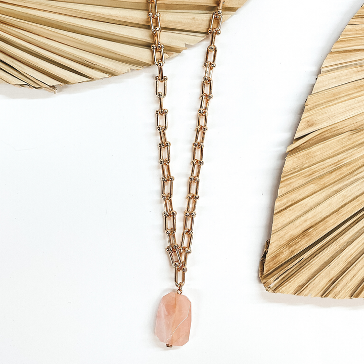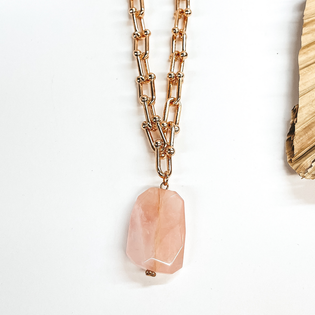 Thick Chain Link Necklace with Chunky Light Pink Stone Pendant