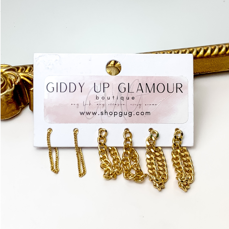 Elevate any look with these gorgeous Three Pair Chain Earrings in Gold Tone. Each elegant earring features a delicate gold tone chain that will sparkle with the slightest movement. Perfect for the modern trendsetter!