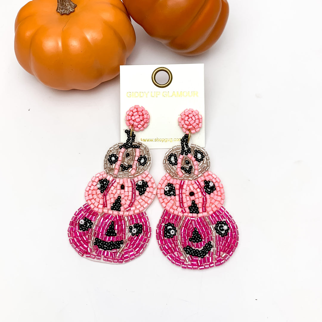 Three Tier Pumpkin Beaded Earrings in Pink. These earrings are pictured on a white background with pumpkins behind the earrings.