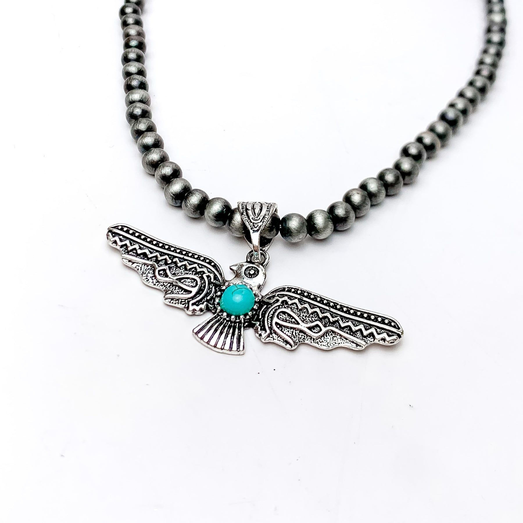 Show your style with our Thunder Bird Pendent Silver Tone Beaded Necklace. This sleek and fashionable necklace features a beautiful silver-tone thunder bird pendent and beaded detailing. The perfect accessory for any outfit!