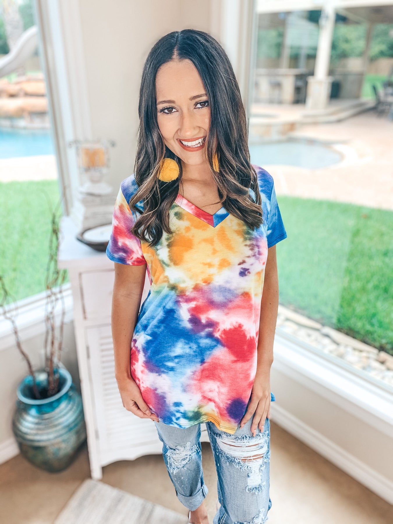 Last Chance Size Small & Medium | Keep Things Simple Tie Dye Print V Neck Tee in Pink, Yellow and Blue