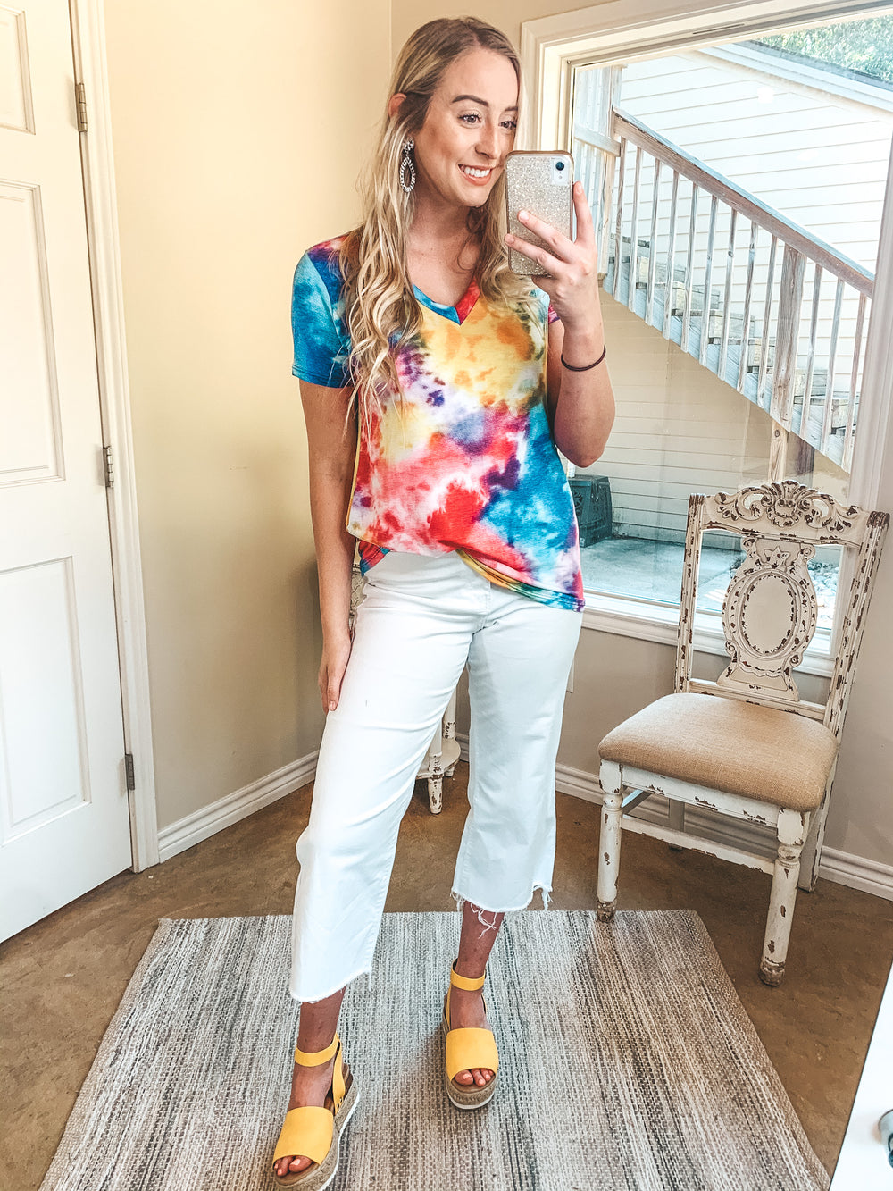 Although we are keeping things simple, this top still gives us so much style! This top includes short sleeves, a v-neckline, a cute tie dye print, and a comfy Bulgarian fabric. The colorful blue, pink, and yellow stands out beautifully on the white background. Pair this with your favorite skinnies or a pair of cut offs! Abby is wearing a size L.