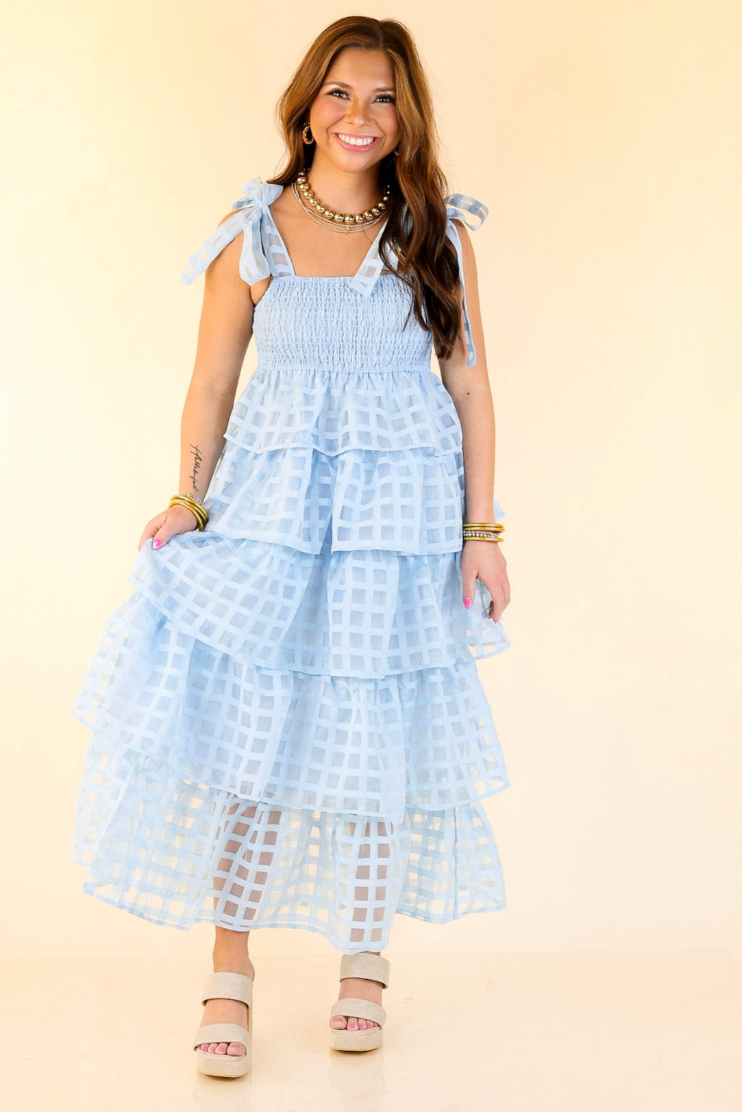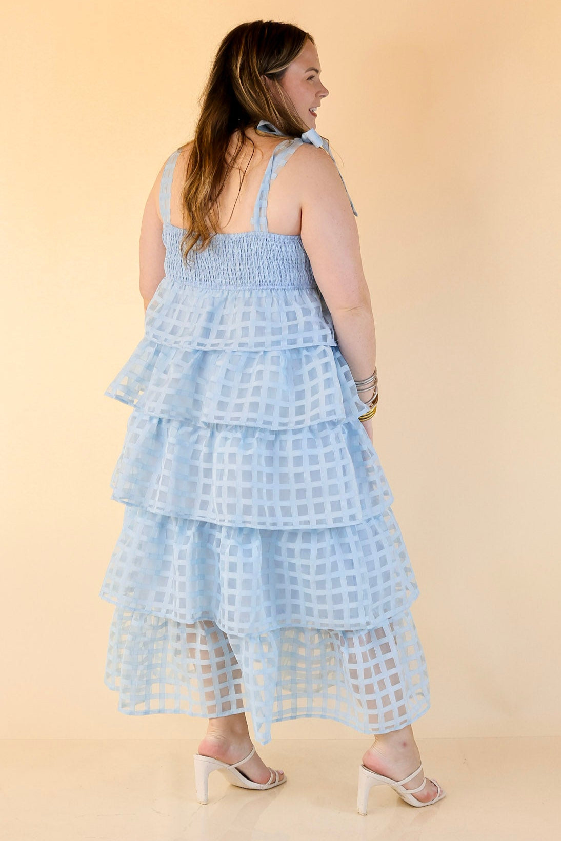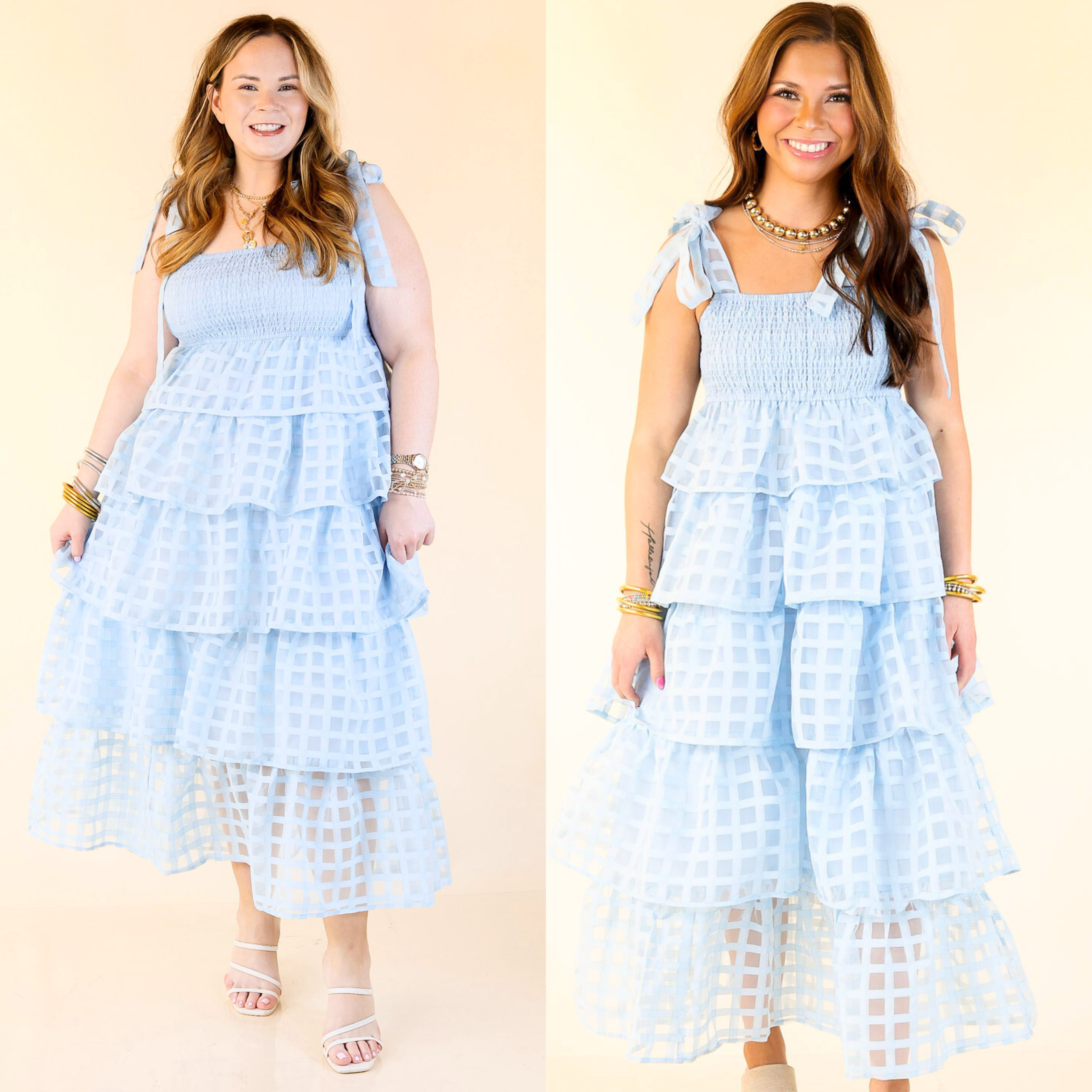 Let the sunshine in. This is your go-to for sweet summer days and picture-perfect moments. With adjustable spaghetti straps that tie into bows, a smocked bodice for a flattering fit, and tiered layers of breezy checkered fabric, this midi dress brings all the charm. The soft light blue hue feels fresh and feminine—perfect for brunch dates, beach strolls, or backyard celebrations.
