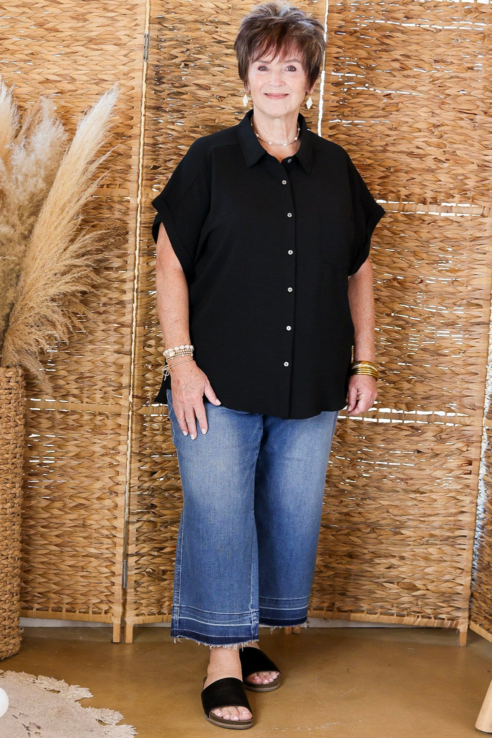 Elevate your wardrobe with the Timeless Appeal top—an effortlessly chic oversized button-up designed for ultimate versatility. Featuring a classic collar, front pocket, and subtle high-low hemline with small side slits, this top offers a relaxed yet polished look. Whether styled with denim for a casual day out or layered over leggings for an easygoing vibe, this must-have piece transitions seamlessly from season to season.