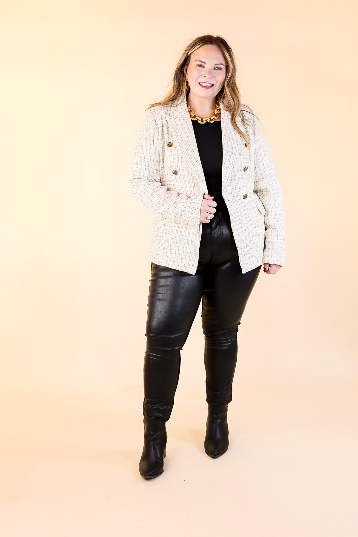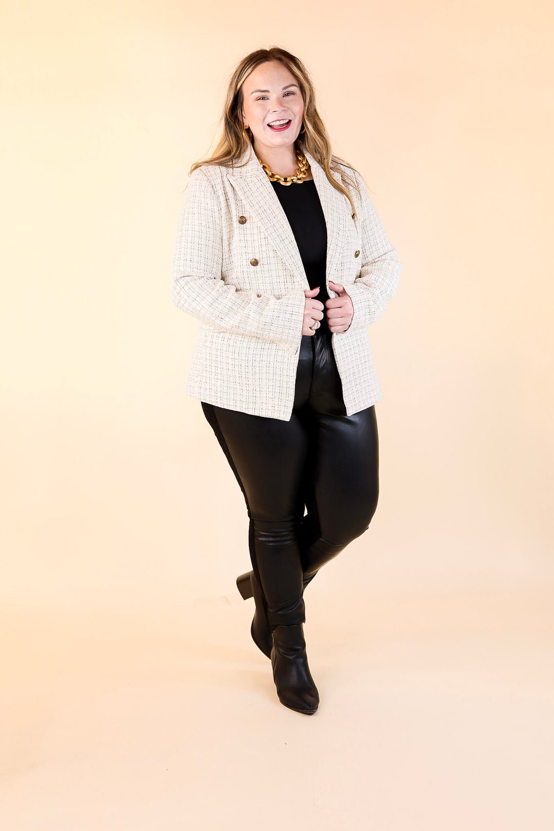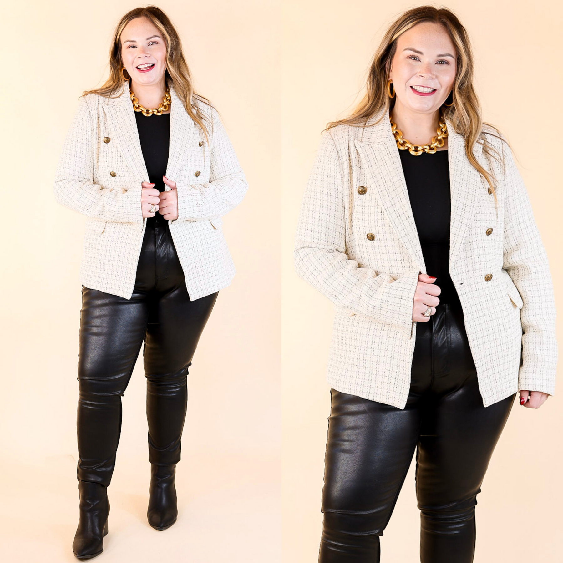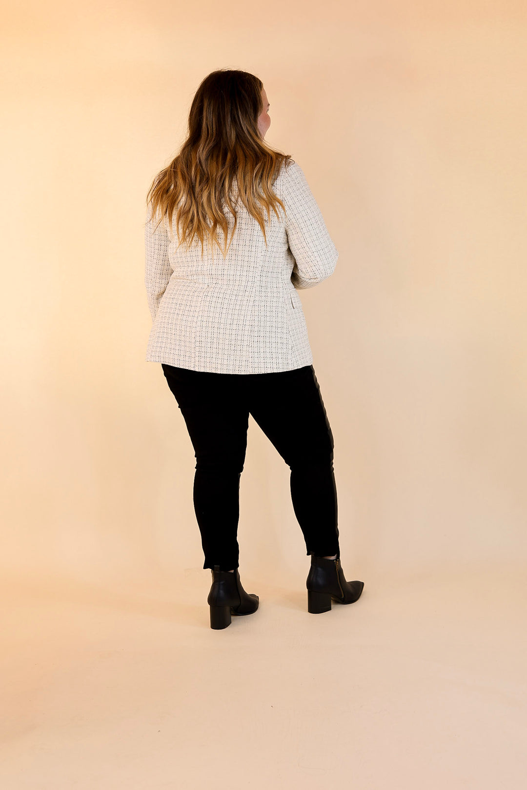 Luxurious style meets timeless sophistication with the Timeless Tales Tweed Blazer with Bronze Buttons in Ivory. This stunning piece of outerwear features a classic tweed pattern of ivory and black hues, a collared neckline, long sleeves, and hip pockets with bronze buttons. Look effortlessly stylish and make a statement in this timeless piece. Blazer is lined.