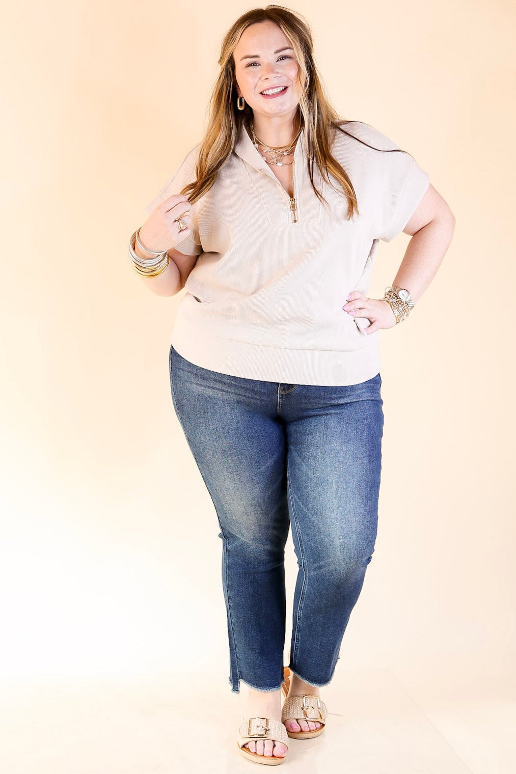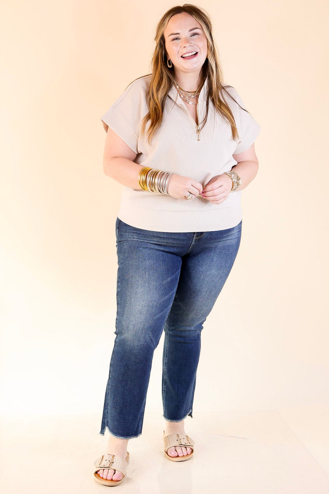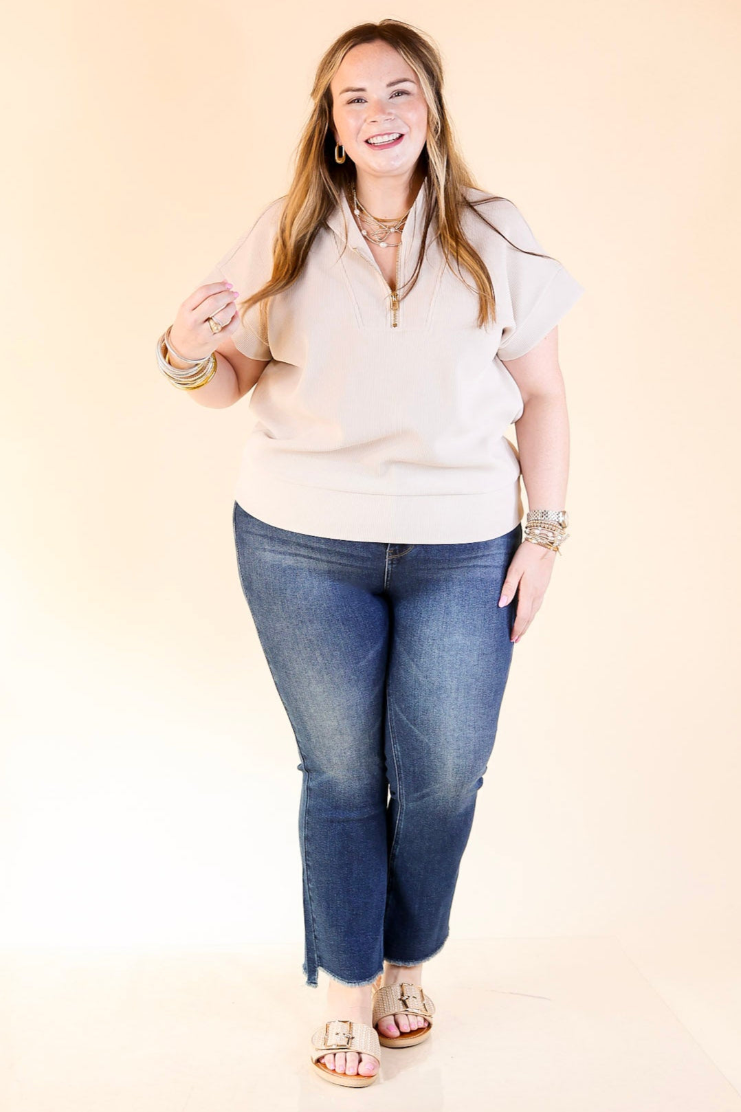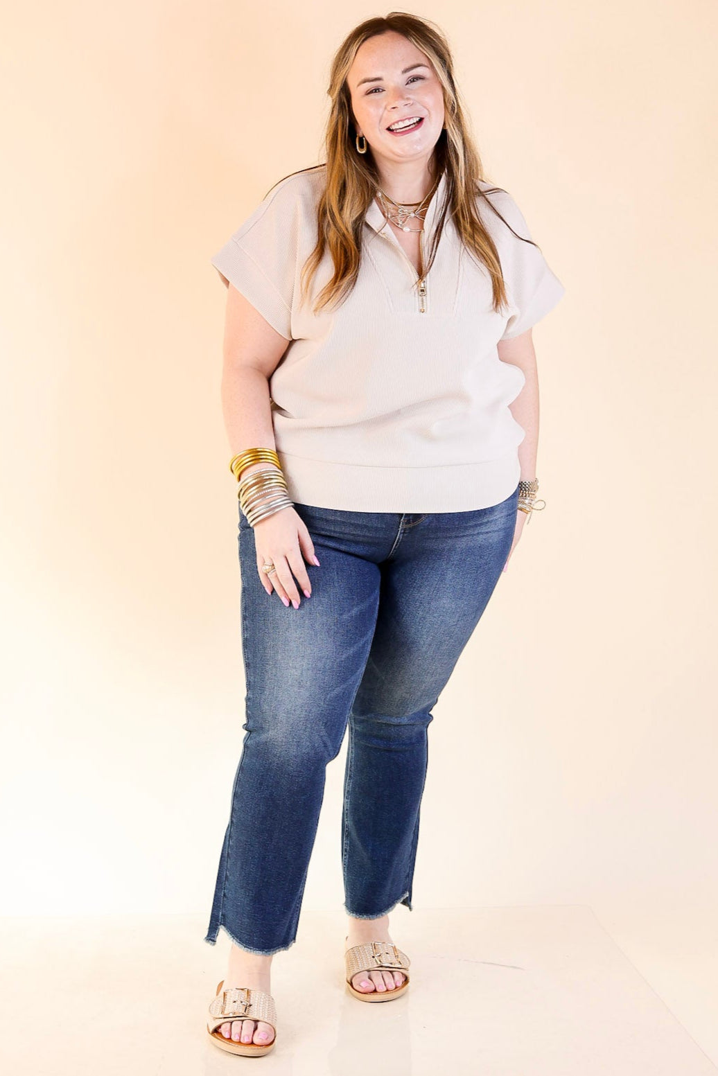 Top Priority Half Zip Collared Ribbed Top in Sand Beige