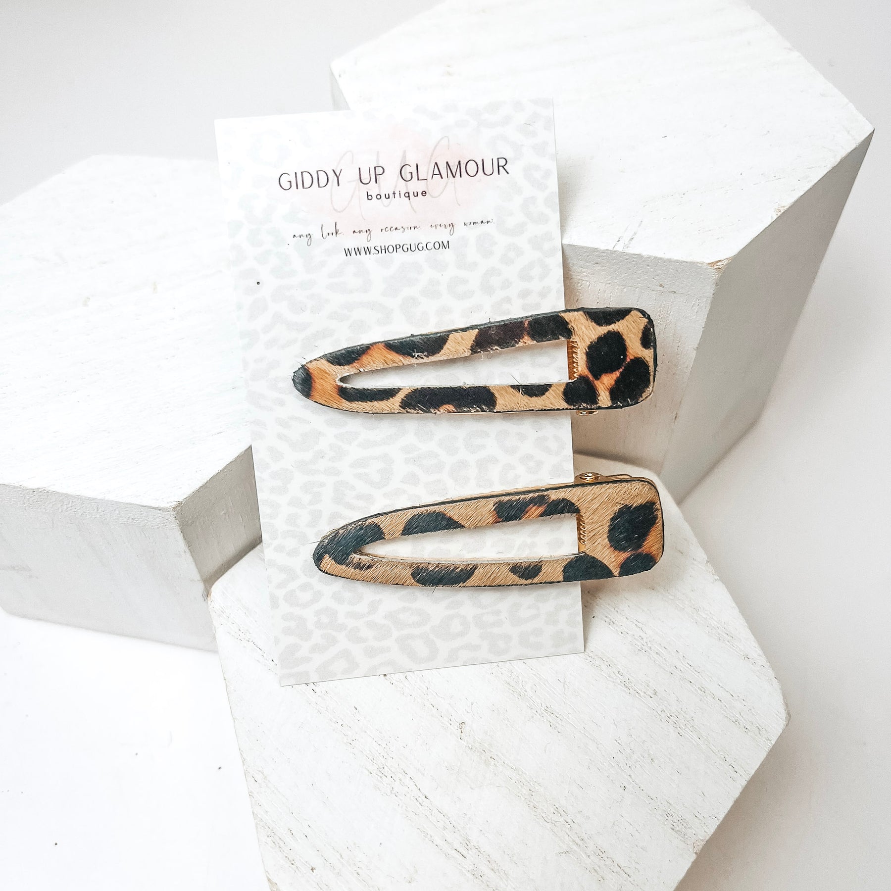 This pair of stunning hair clips will elevate your look! Crafted with a beautiful faux cheetah fur print, the two triangular clips will make your hairstyle stand out. Show off your unique style!