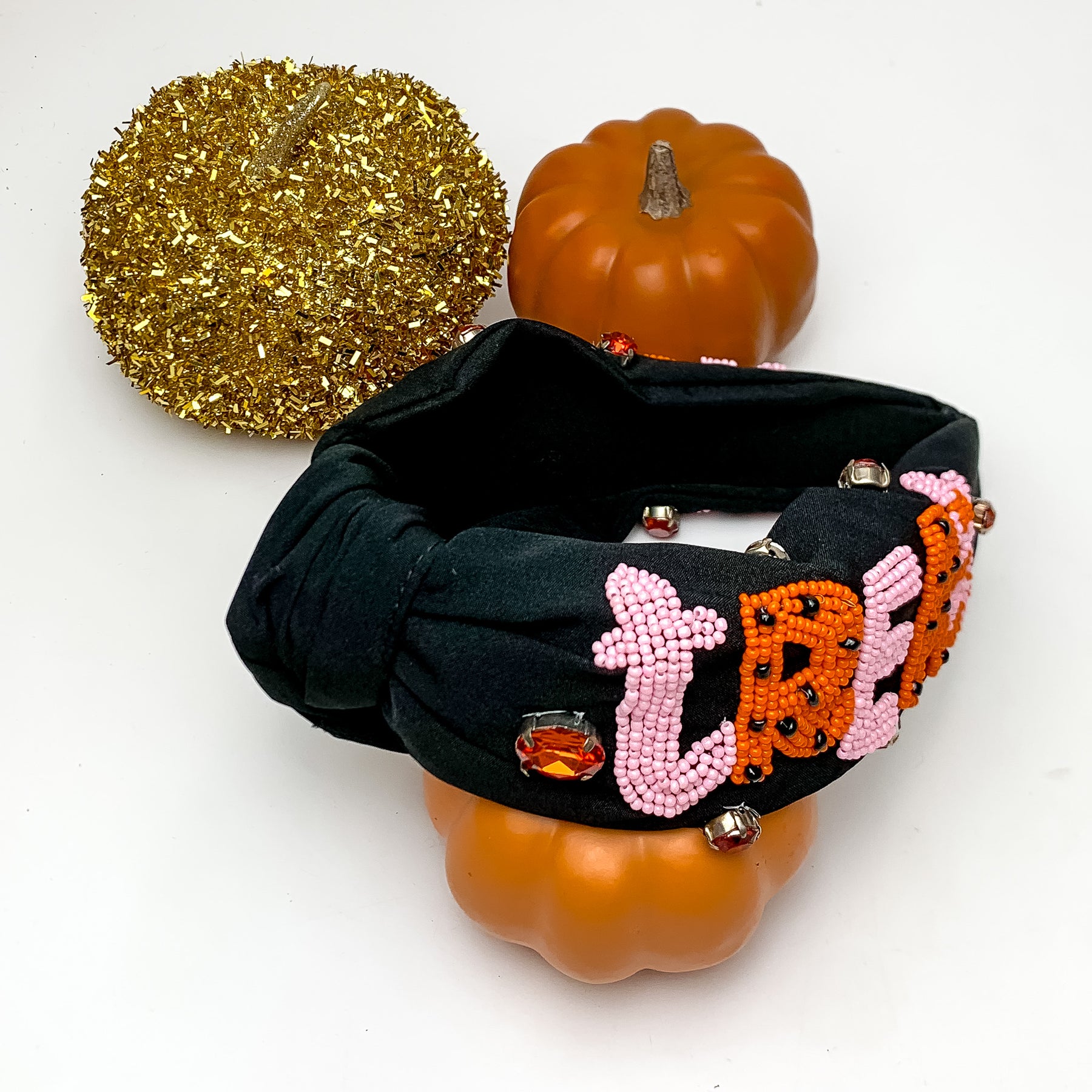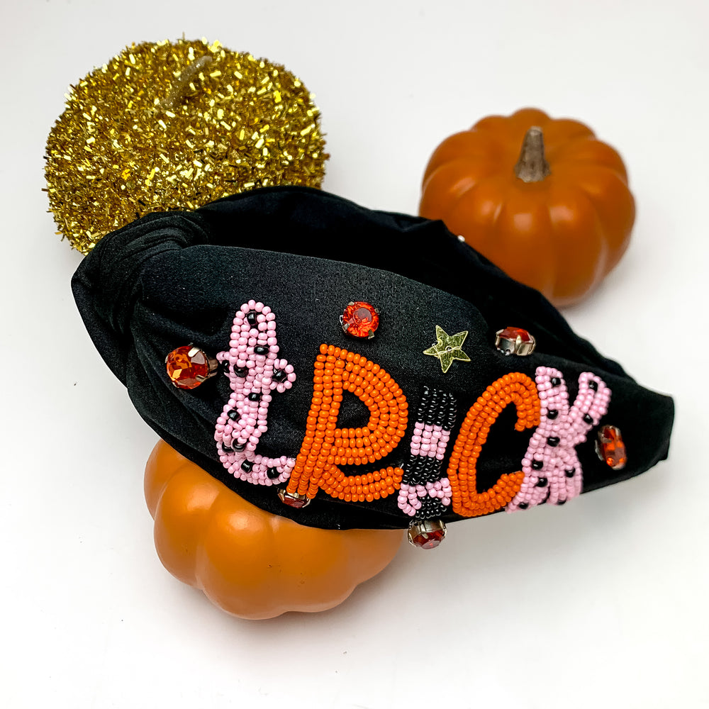 "Trick or Treat" Orange and Pink Beaded Headband in Black