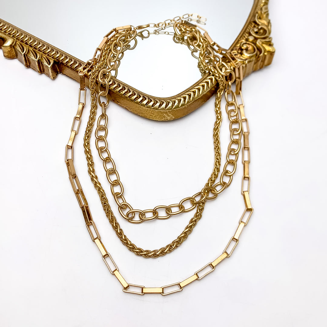 This Three Strand Variety Gold Tone Chain Necklace is a stunning accessory for any occasion! Easily matches all your go to outfits.
