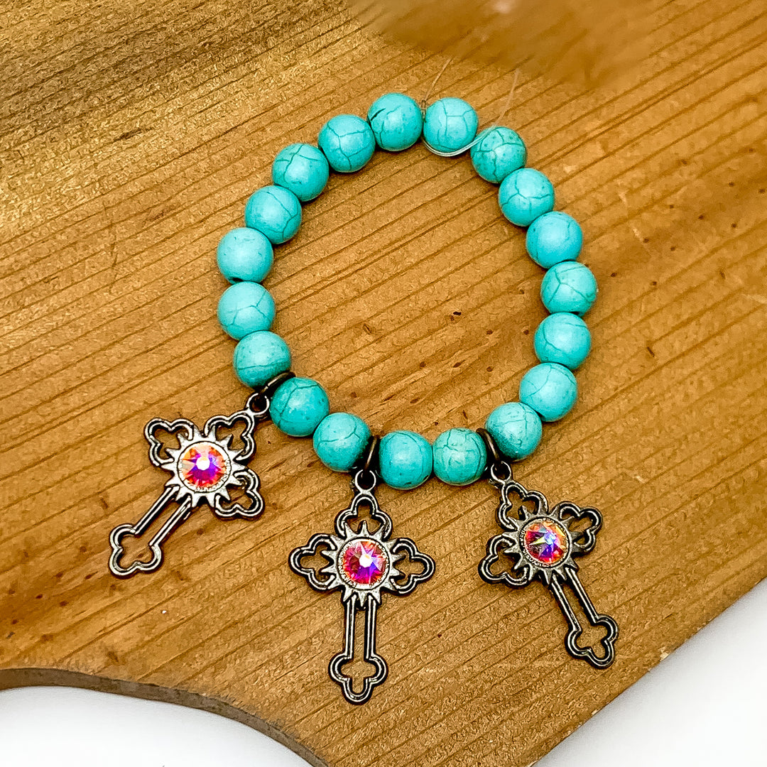 Turquoise Blue Beaded Bracelet with Silver Tone Cross Charms