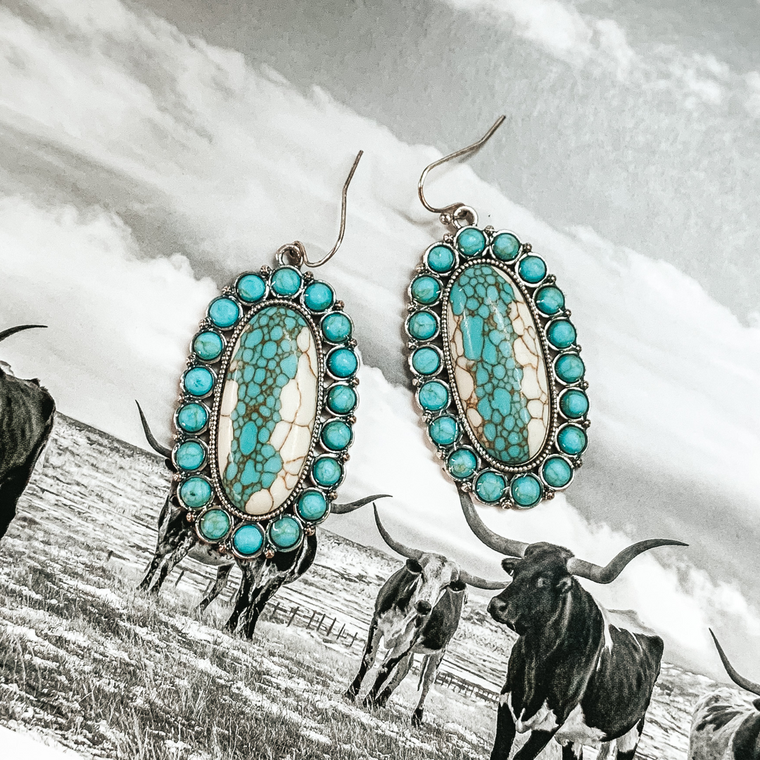 Turquoise Cluster Oval Dangle Earrings in Silver Tone