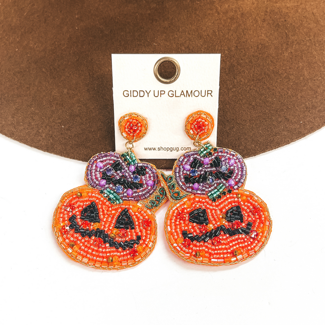 Two Tiered Seedbeaded and Crystal Pumpkin Post Earrings in Orange and Purple