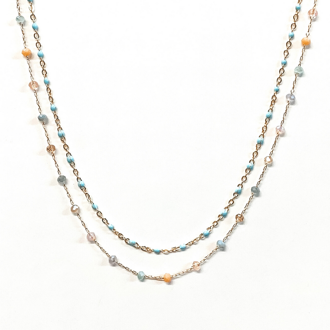 Two Strand Gold Chain Necklace with Bead Spacers in Baby Blue Multi