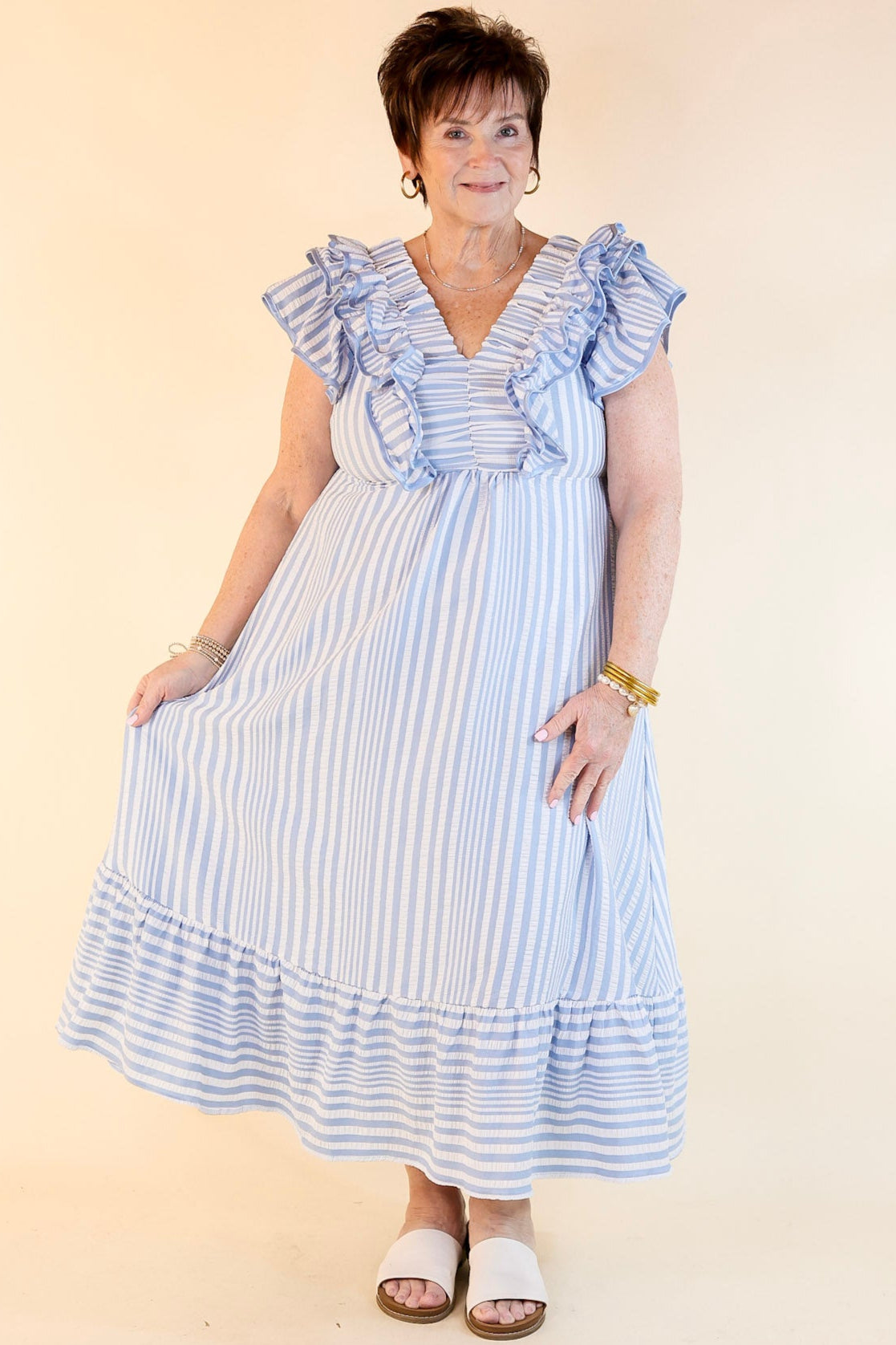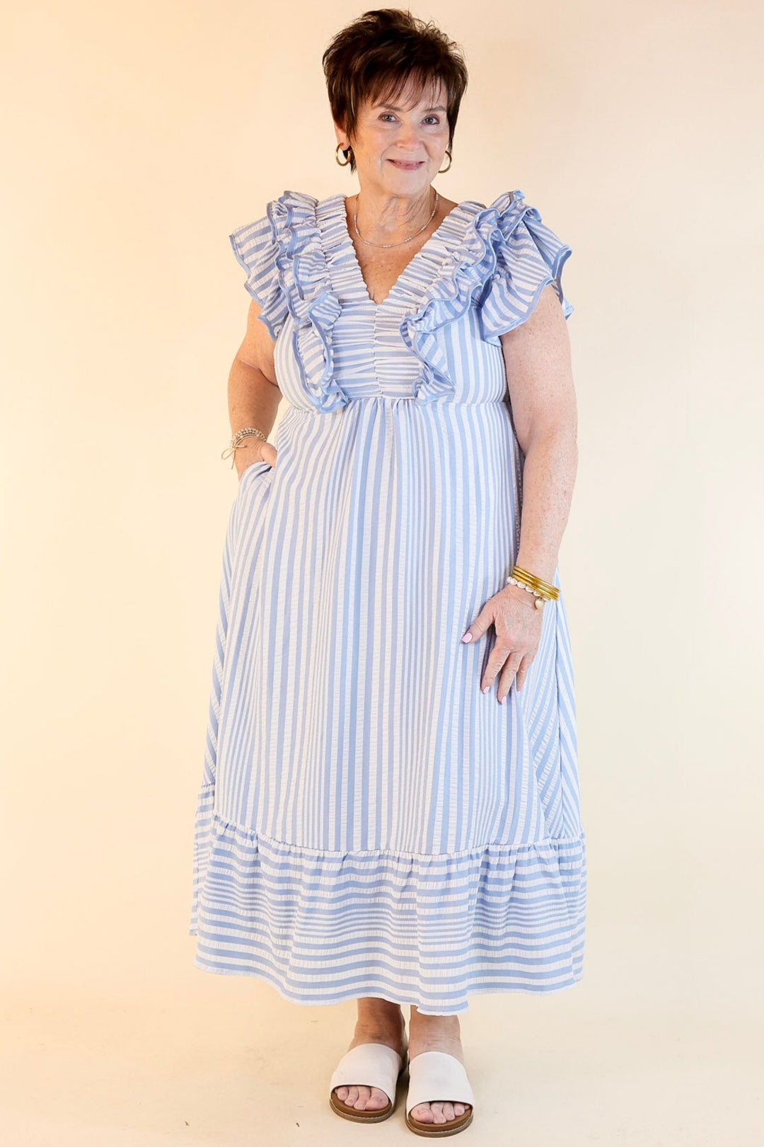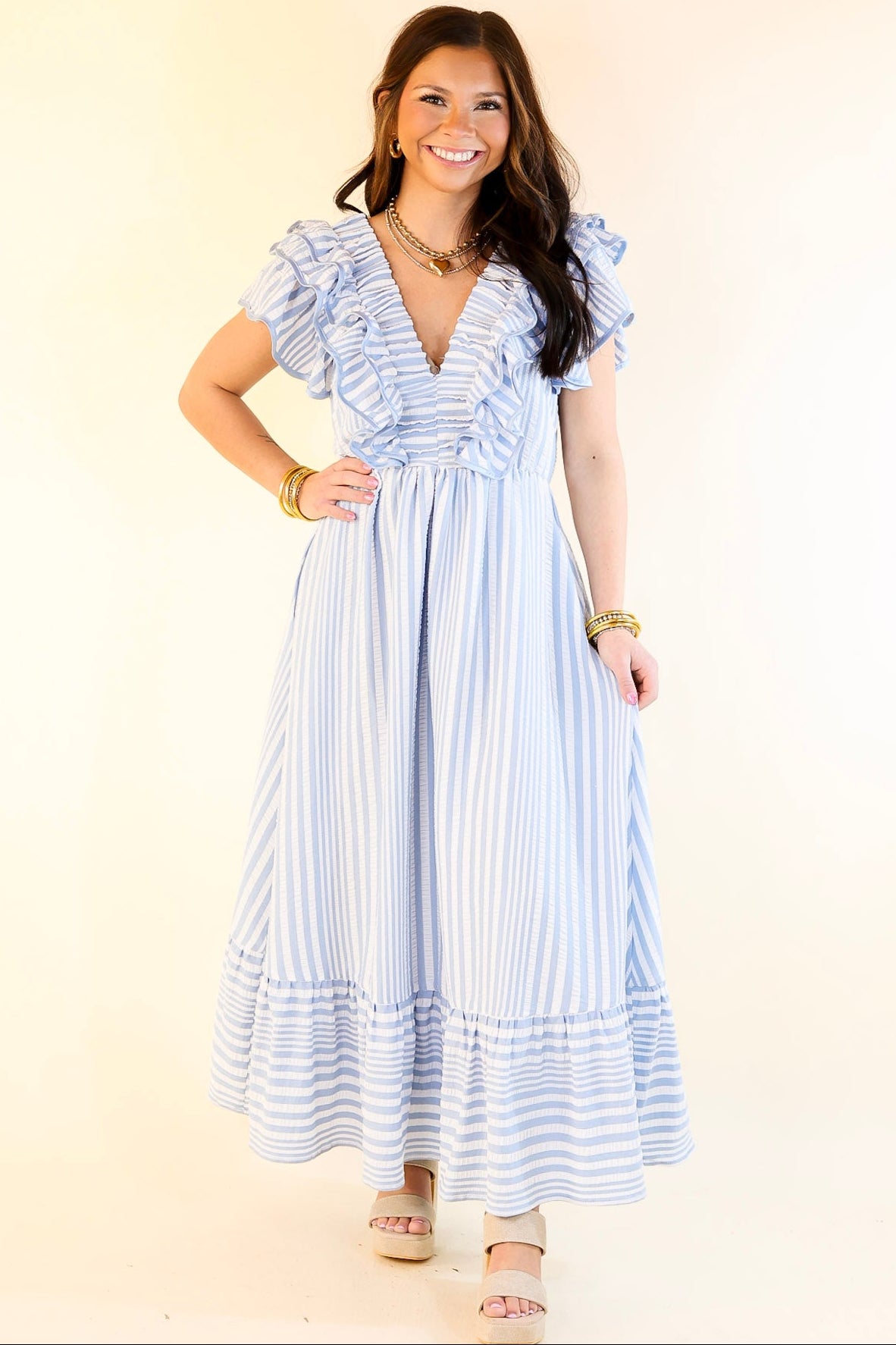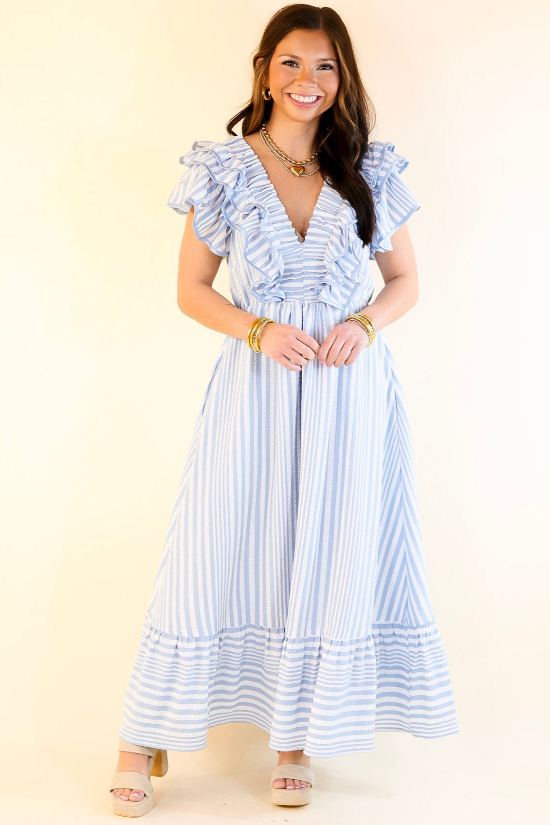 Soft, stylish, and oh-so-charming—the Oh So Sweet dress is the perfect blend of elegance and everyday ease. Designed with a classic striped print, this maxi-length dress creates a flattering, elongated silhouette. The V-neckline adds a feminine touch, while the ruffle cap sleeves bring a playful and romantic vibe. Lightweight and breezy, this dress is ideal for spring and summer events, brunch dates, vacations, and effortless everyday wear.