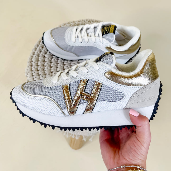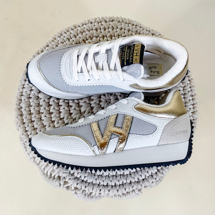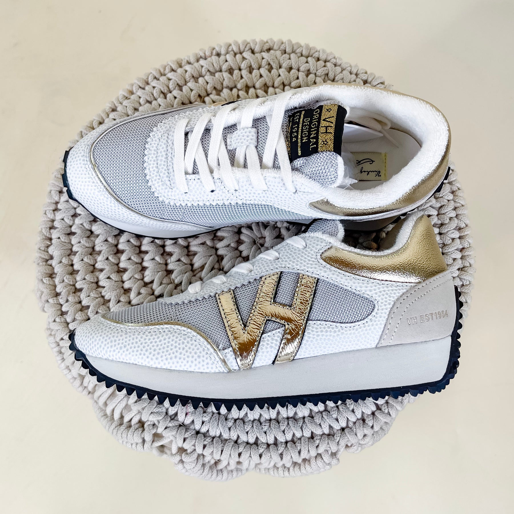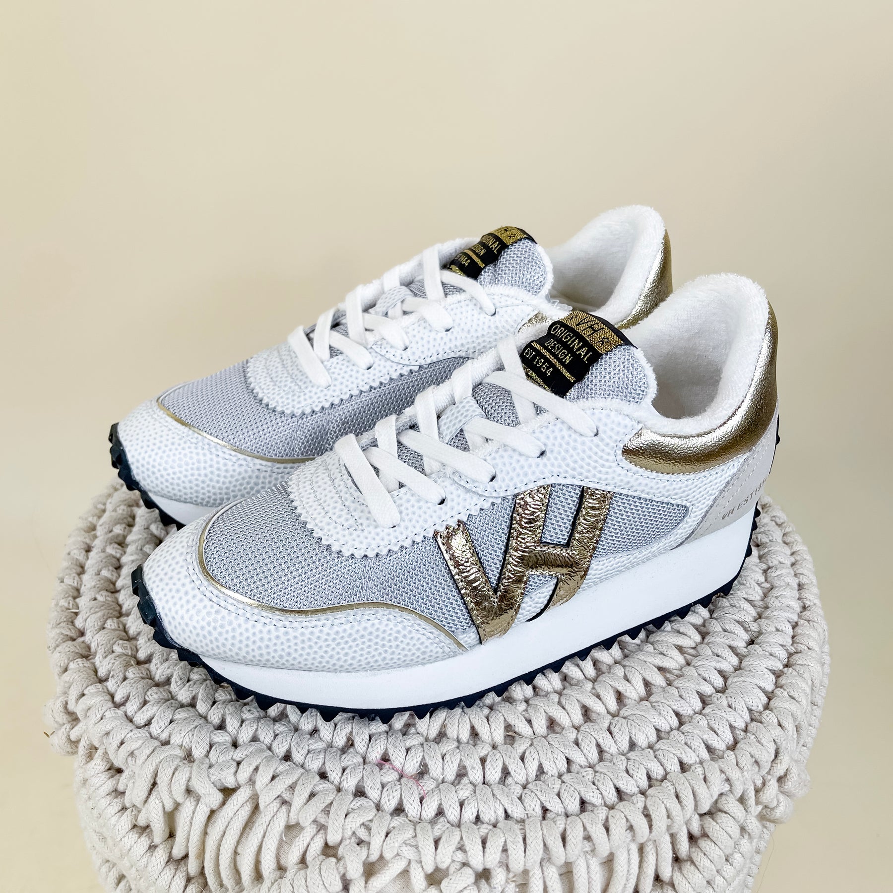 Introducing the latest addition to our lineup: Vintage Havana's Cosmic 8 sneakers! These stylish shoes boast a pebbled white exterior, gold and black tab, grey mesh, and a spiked rubber sole for a touch of edge. Complete with a gold Vintage Havana logo, these sneakers are the perfect blend of fashion and function. Step into style and comfort with the Cosmic 8 sneakers – a must-have for any fashion-forward wardrobe!