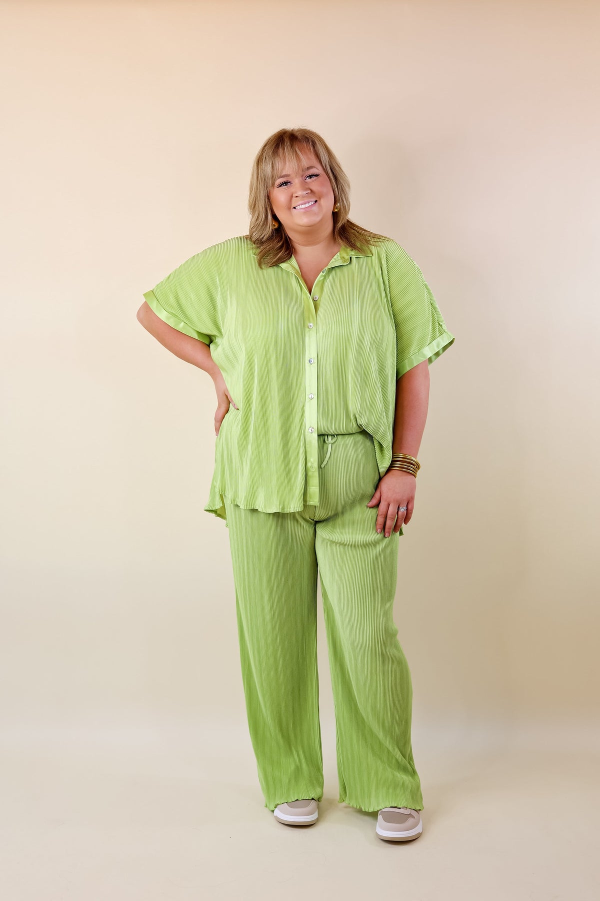Experience ultimate comfort with the Walking in Paradise Plissé Button Up Top in Green. Featuring a lightweight fabric and a button-up design, this top ensures a snug and secure fit, giving you a reliable and fashionable look. Enjoy the perfect combination of style and breathability with this unique top. Effortlessly move from day to night in total style. Grab the matching bottoms for a fun look!