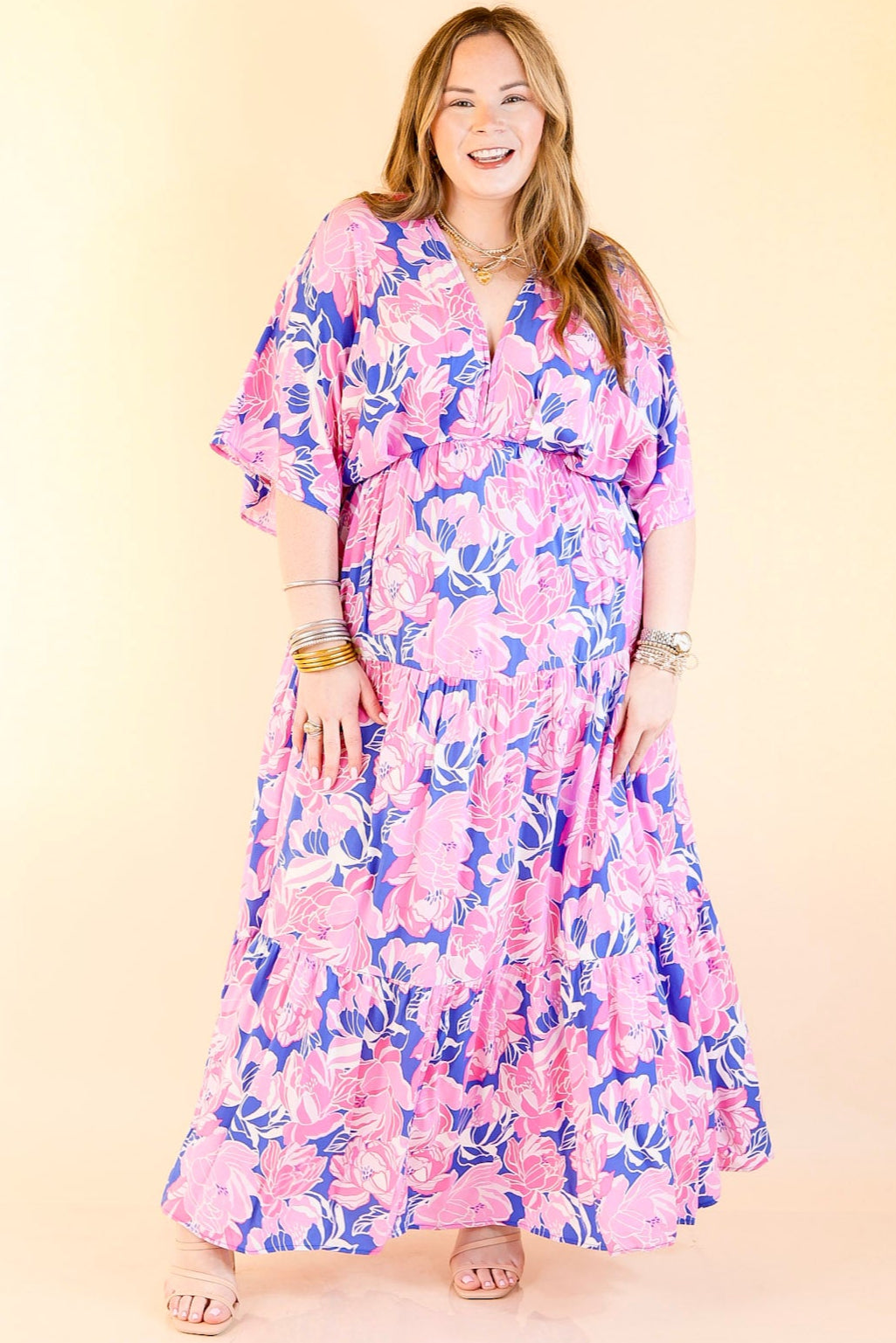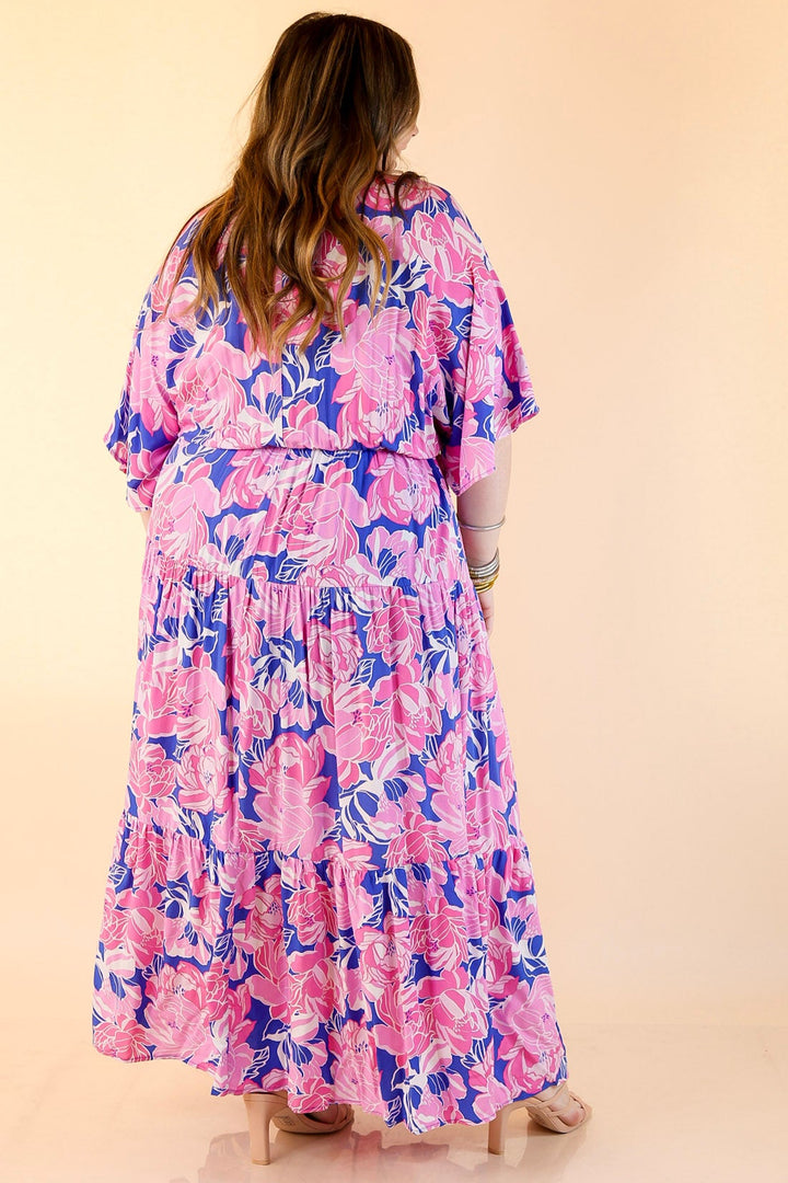 Greet the day with style in the Waving Hello Floral Maxi Dress. Featuring a flattering v-neckline, drop sleeves, and maxi length, this stunning dress is adorned with a beautiful blue and pink floral print. Perfect for any occasion!