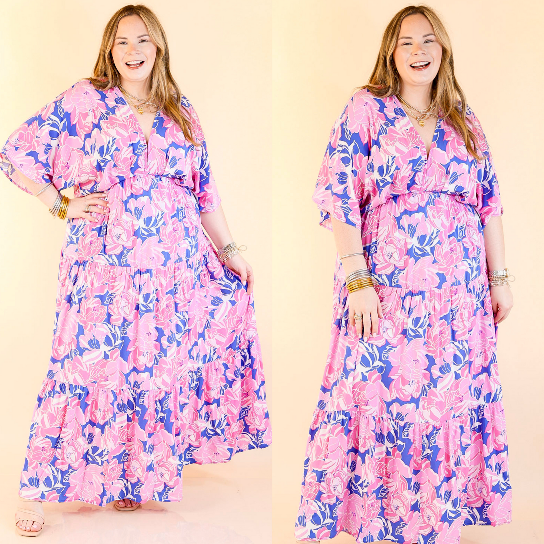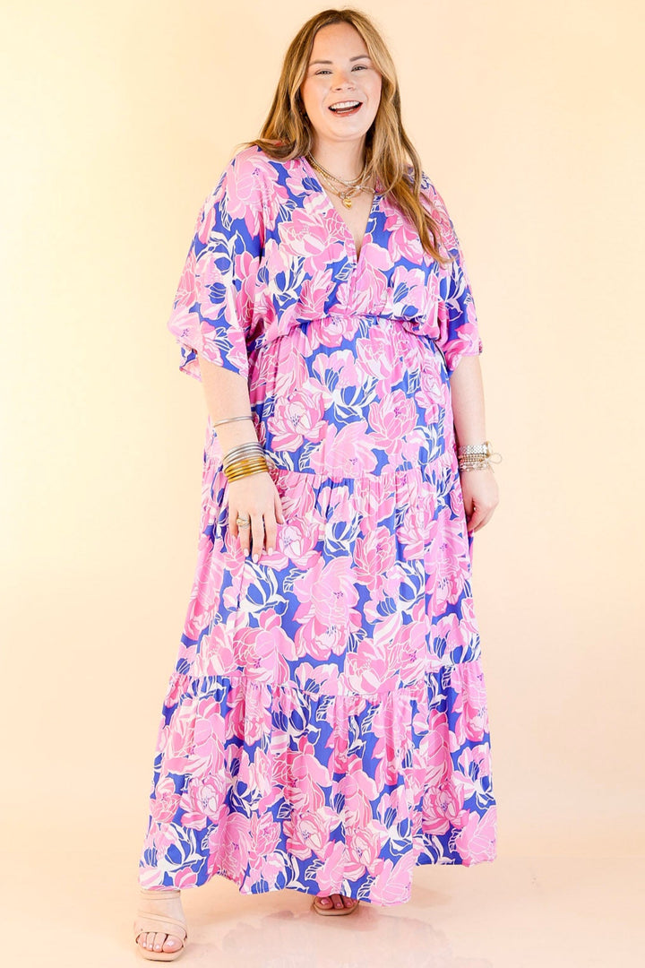 Waving Hello Floral Maxi Dress with V Neckline in Blue and Pink