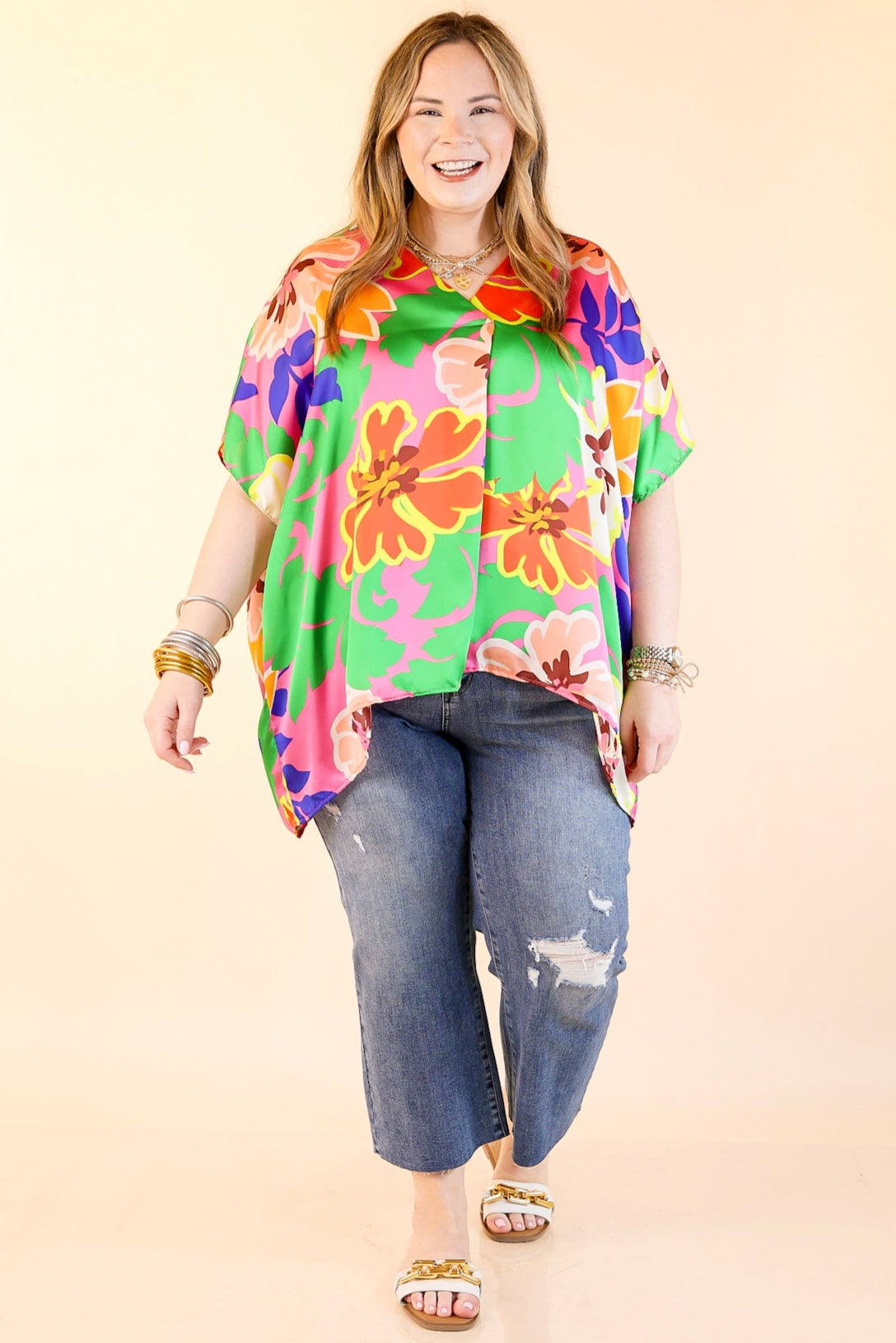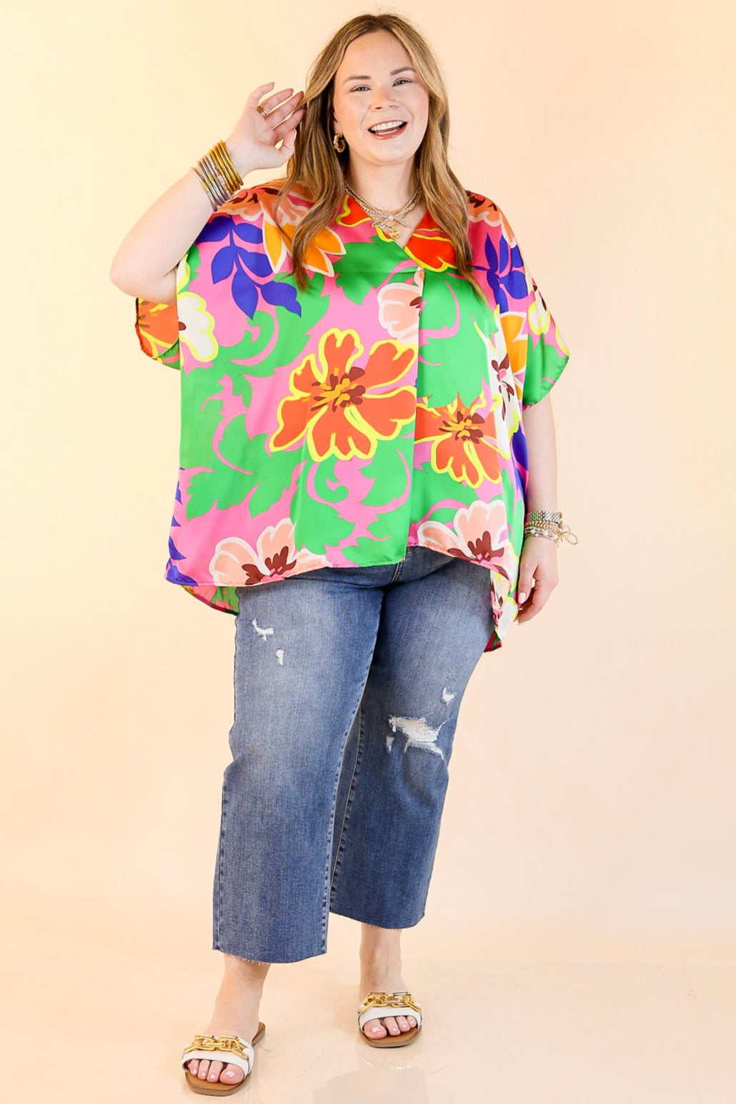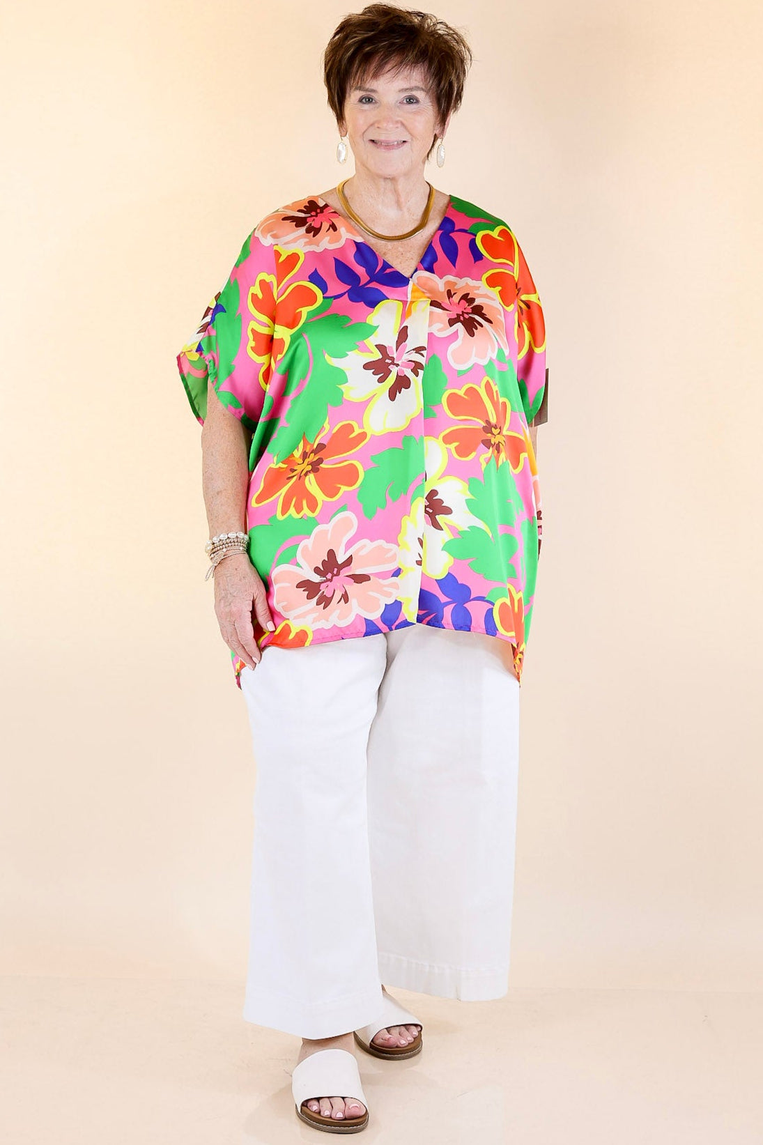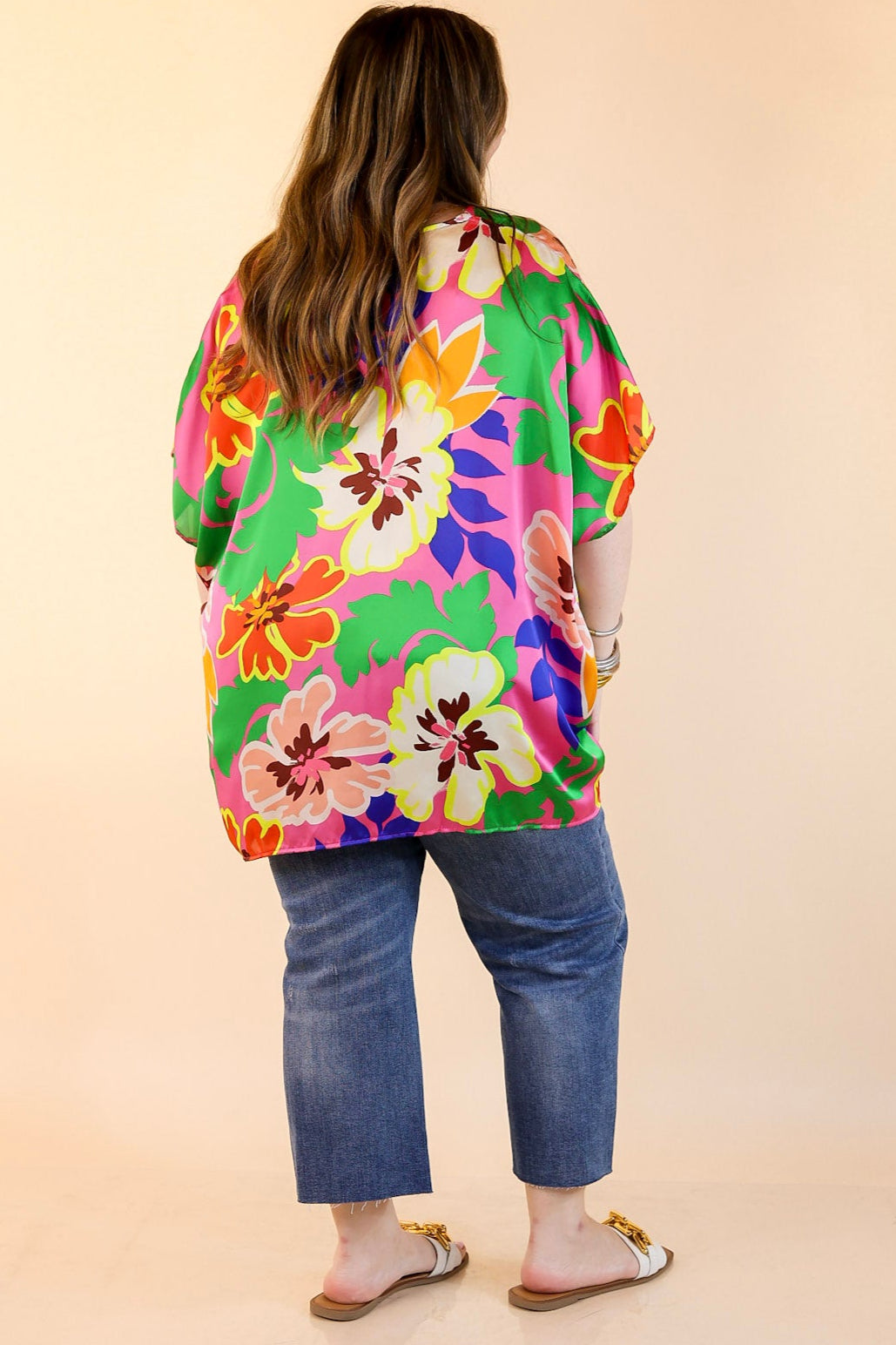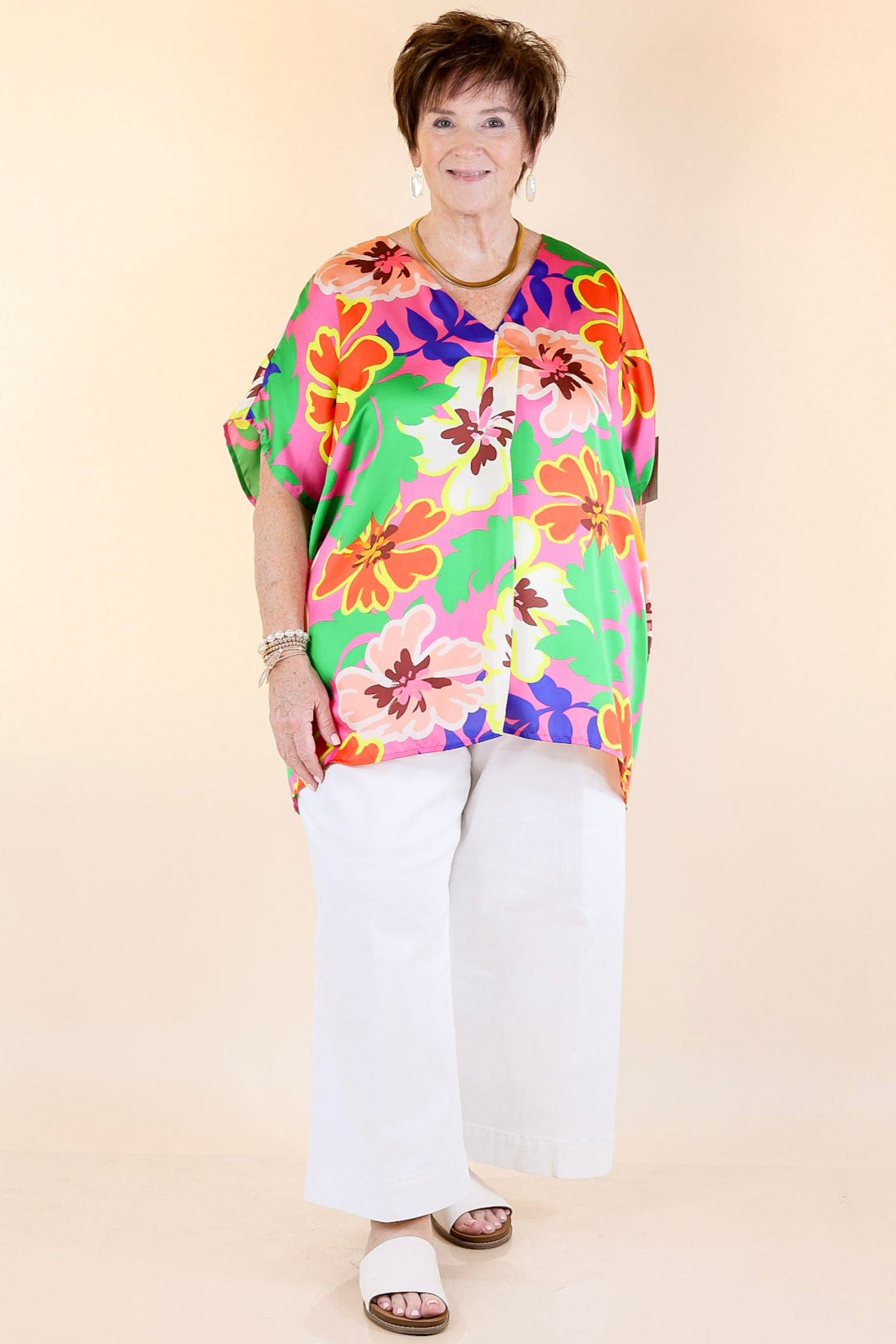 This Weekend Out V Neck Placket Floral Short Sleeve Top is perfect for your weekend getaways. Crafted from lightweight fabric, its features include a v-neckline with a placket, and short drop sleeves with a floral print in pink, green, orange, yellow, and blue. Stay comfortable while looking chic in this fashionable top. Pair it with Judy Blue Jeans and sandals for a fun look!