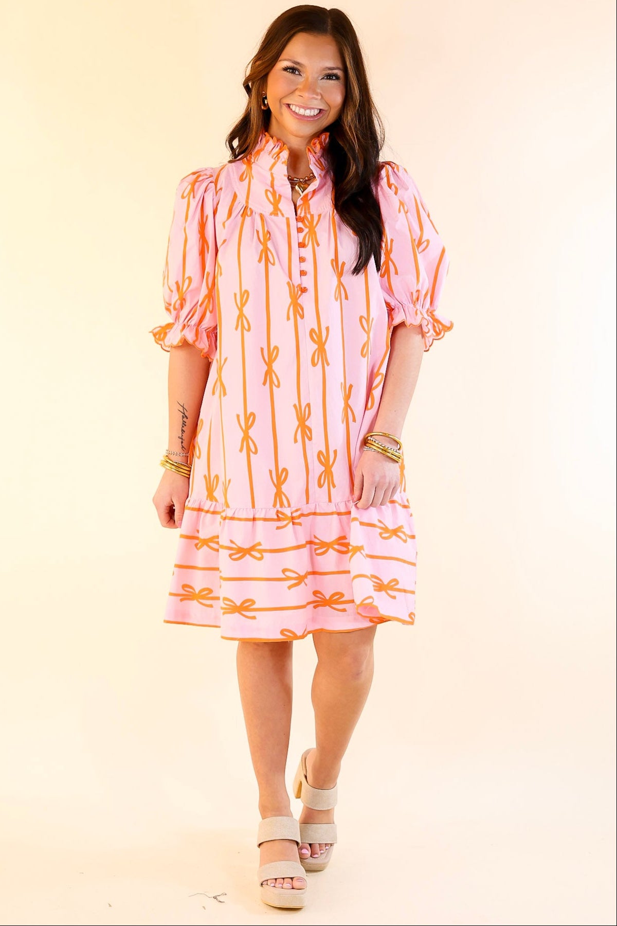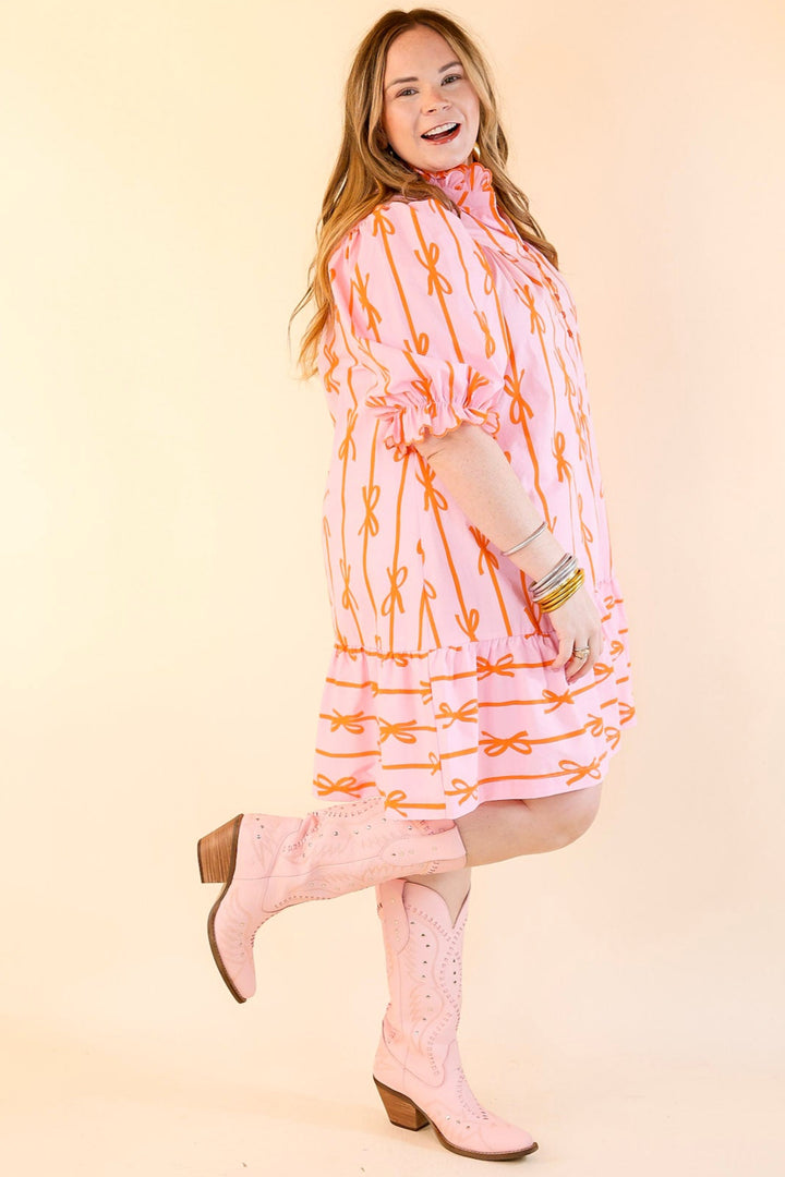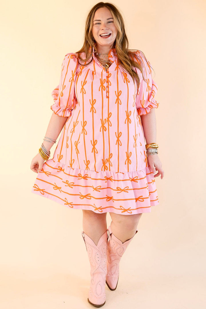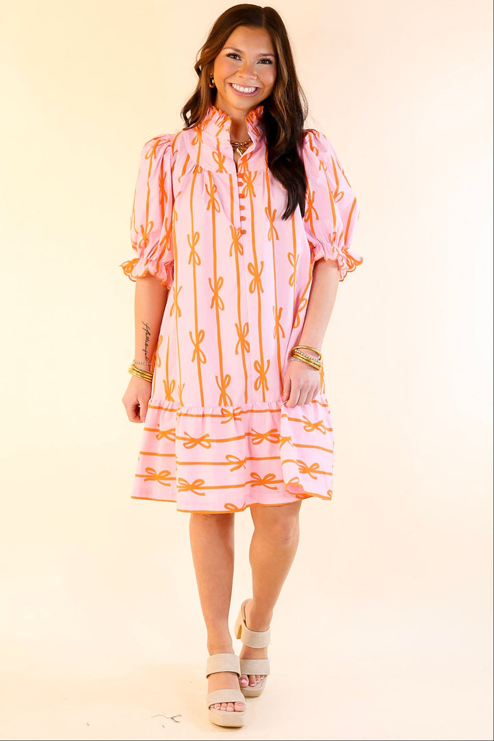 Step into a world of charm and elegance with the Whimsical Dream dress. This feminine dress features a delicate ruffled collar and short puff sleeves adorned with playful ruffles. The buttons that run halfway down the front create a classic yet modern look, while the all-over bow print adds a whimsical touch. Perfect for a special occasion or a stylish day out, the Whimsical Dream dress exudes effortless grace and whimsy, making it a must-have for any wardrobe.