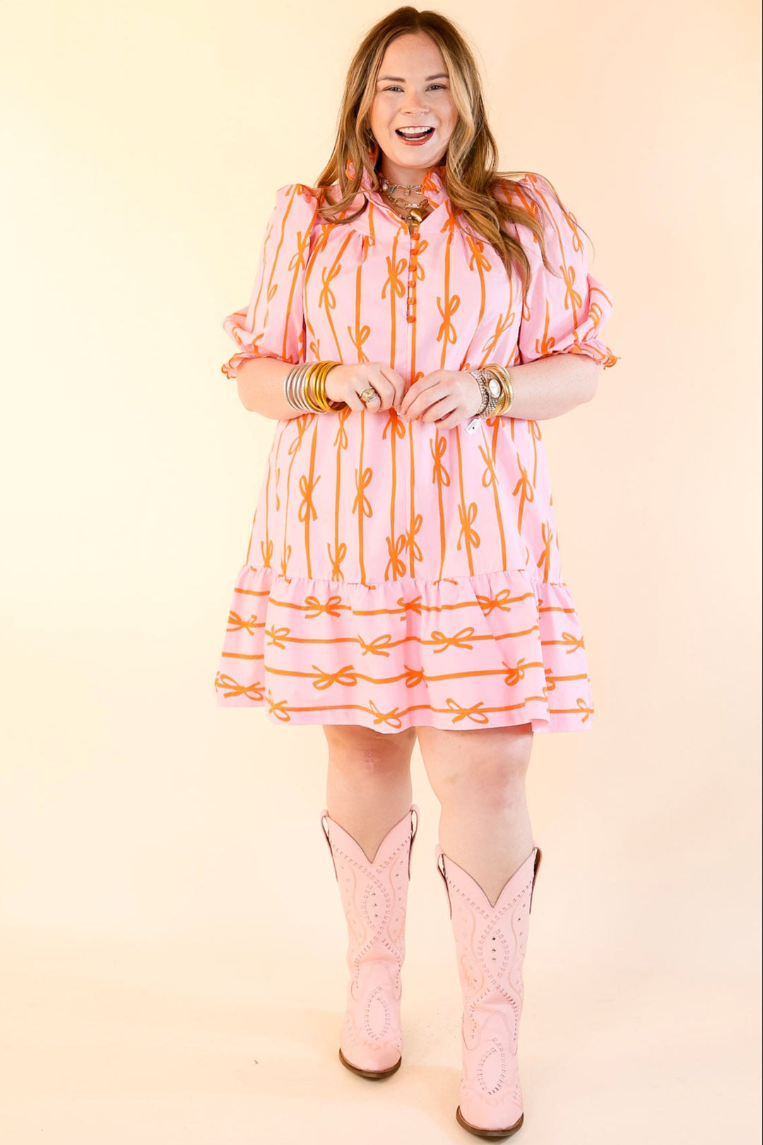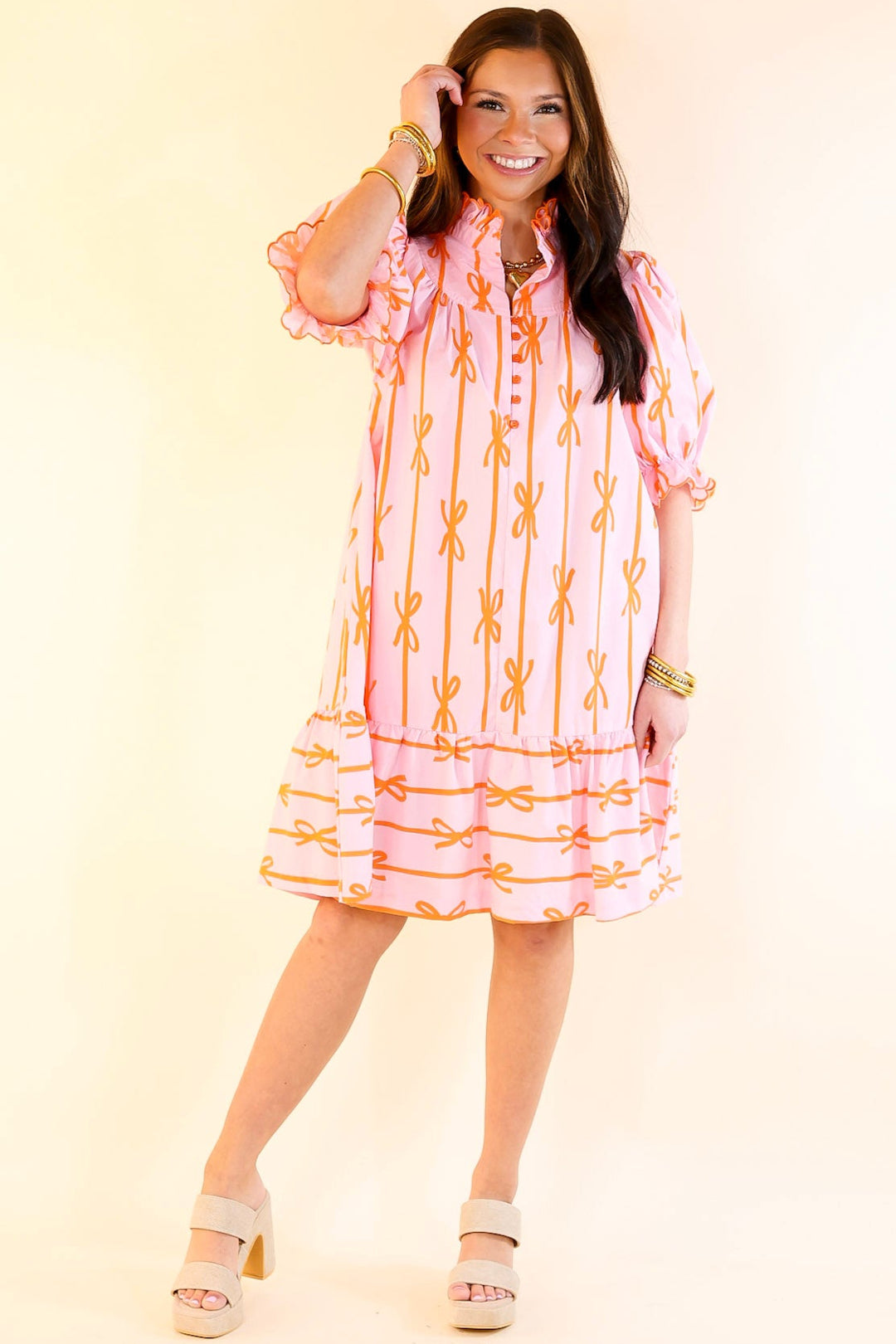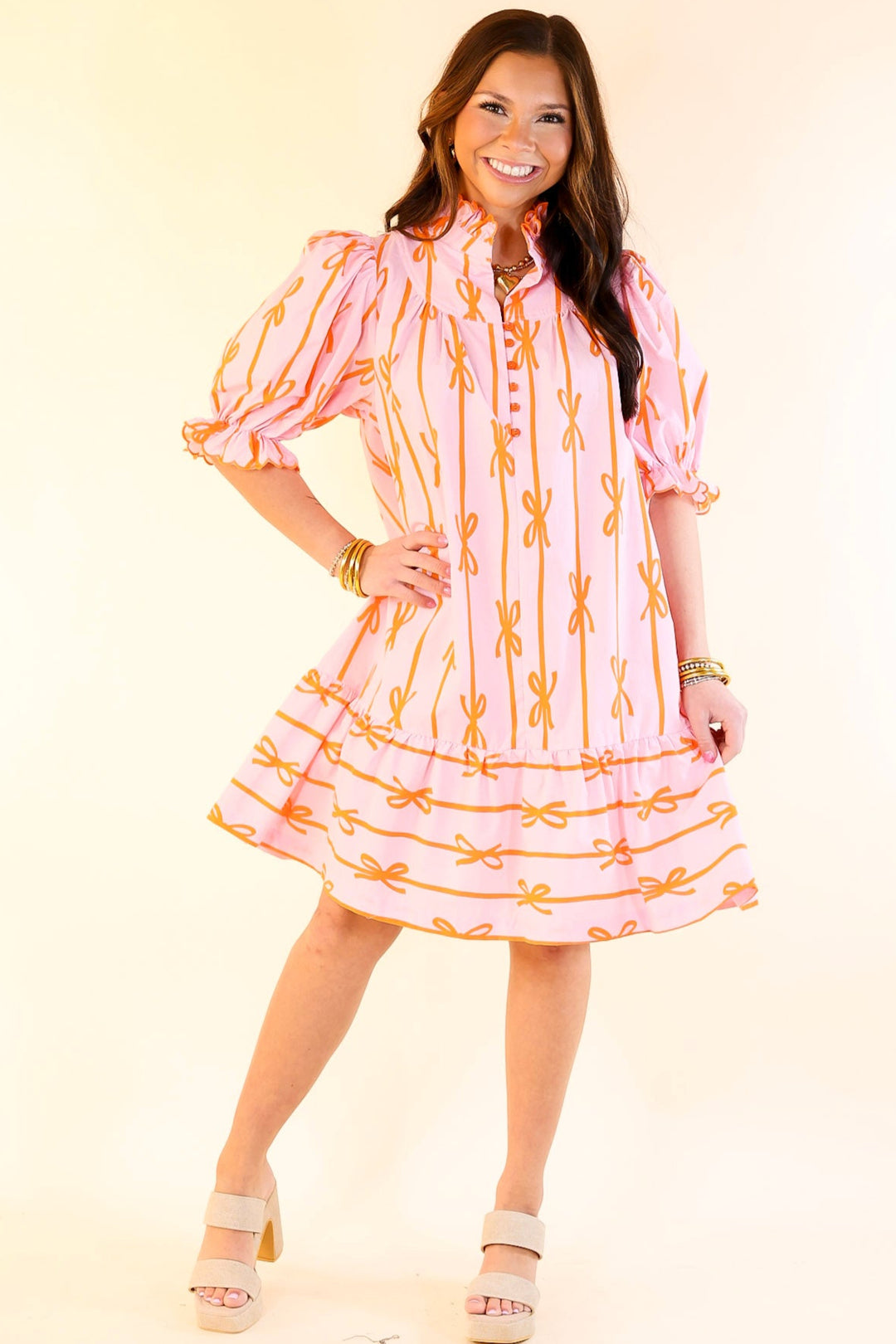 Step into a world of charm and elegance with the Whimsical Dream dress. This feminine dress features a delicate ruffled collar and short puff sleeves adorned with playful ruffles. The buttons that run halfway down the front create a classic yet modern look, while the all-over bow print adds a whimsical touch. Perfect for a special occasion or a stylish day out, the Whimsical Dream dress exudes effortless grace and whimsy, making it a must-have for any wardrobe.