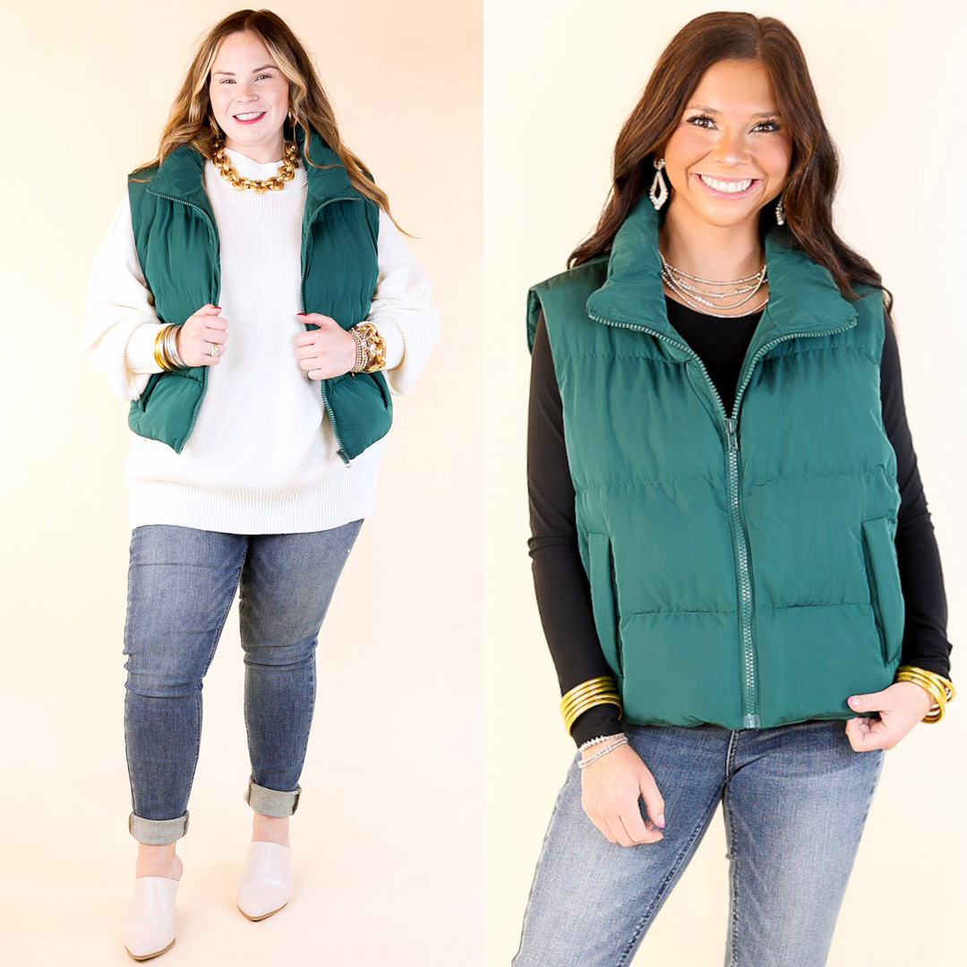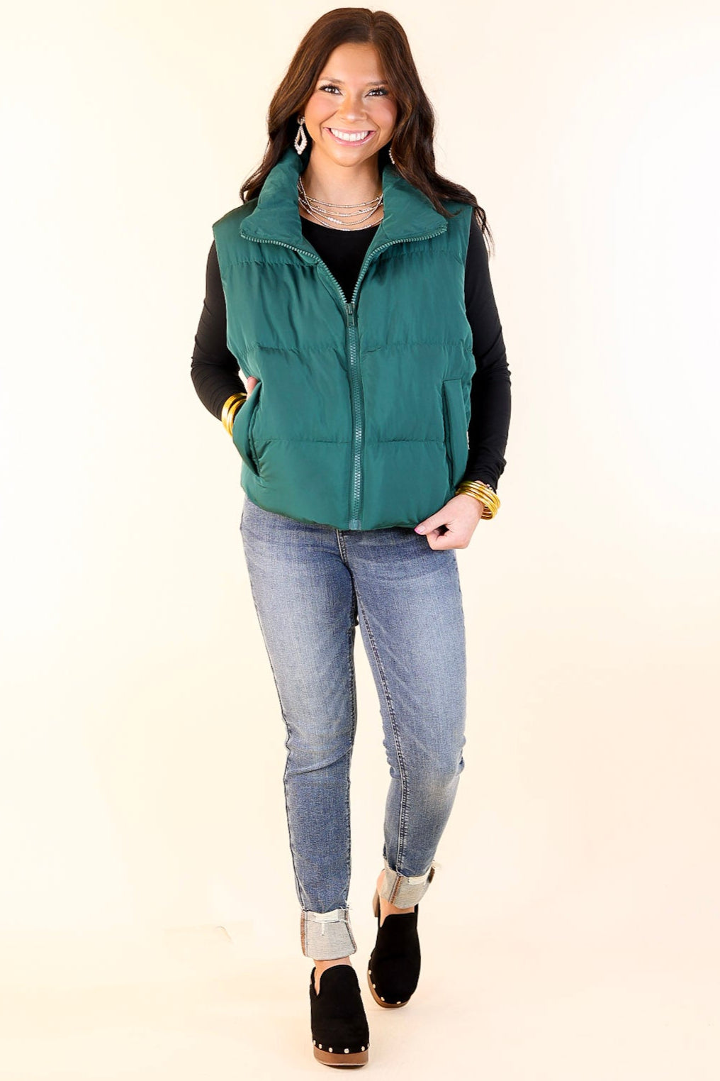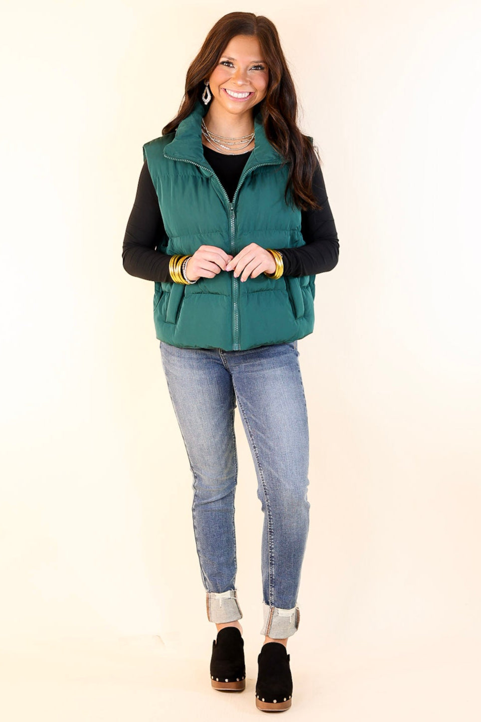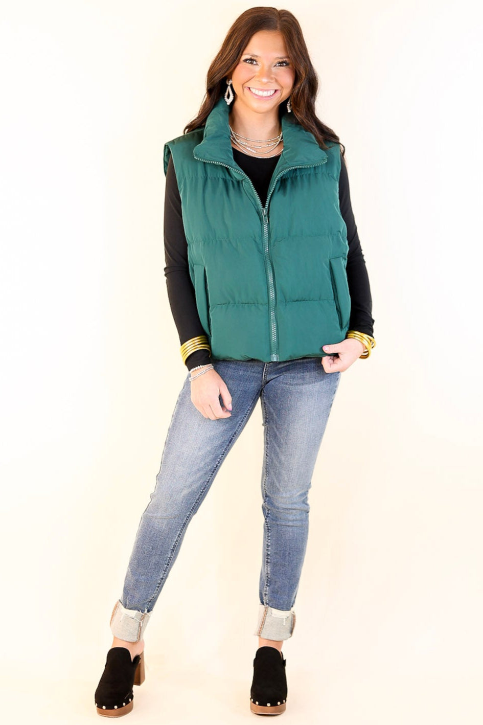 Brave the elements in style with the Whispering Pines Puffer Vest in Hunter Green. This eye-catching zip-up vest features black fabric, front pockets, and a high neck for added warmth. Plus, you'll look as stunning as you feel! Enjoy a pop of color and unbeatable comfort in any weather.
