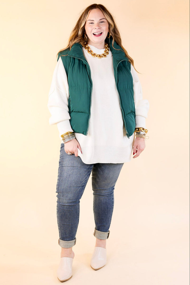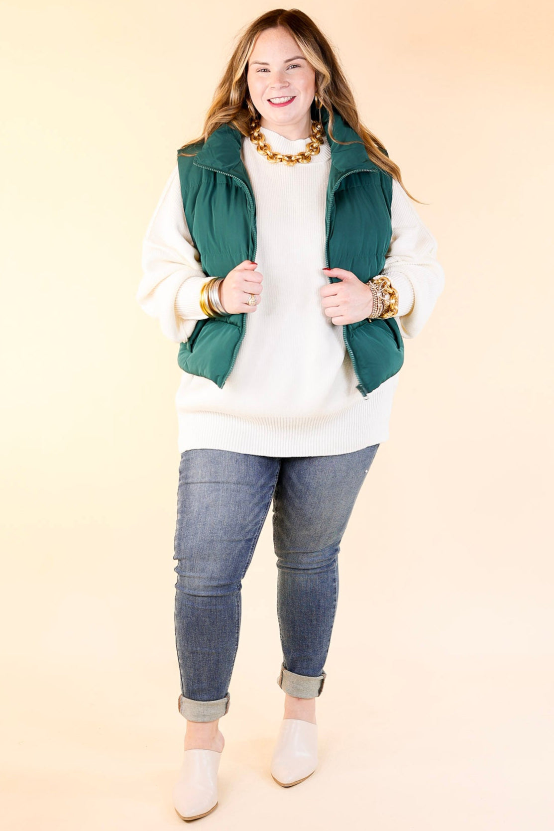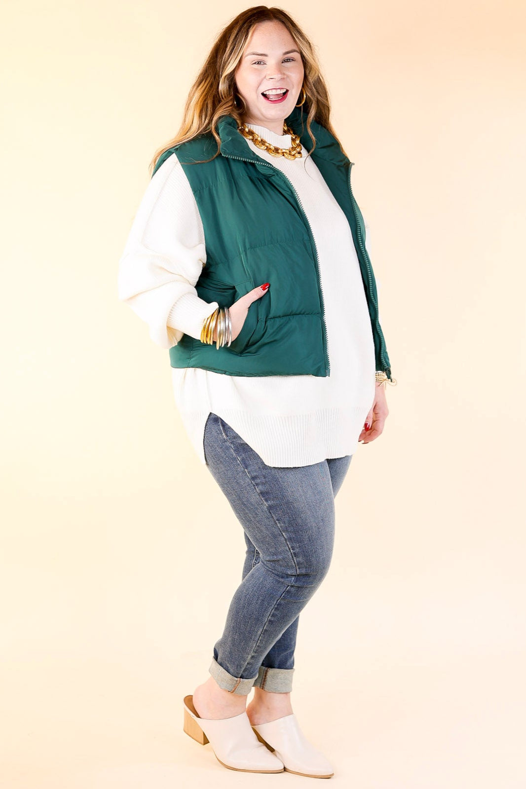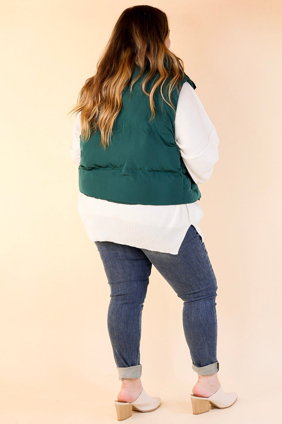 Brave the elements in style with the Whispering Pines Puffer Vest in Hunter Green. This eye-catching zip-up vest features black fabric, front pockets, and a high neck for added warmth. Plus, you'll look as stunning as you feel! Enjoy a pop of color and unbeatable comfort in any weather.