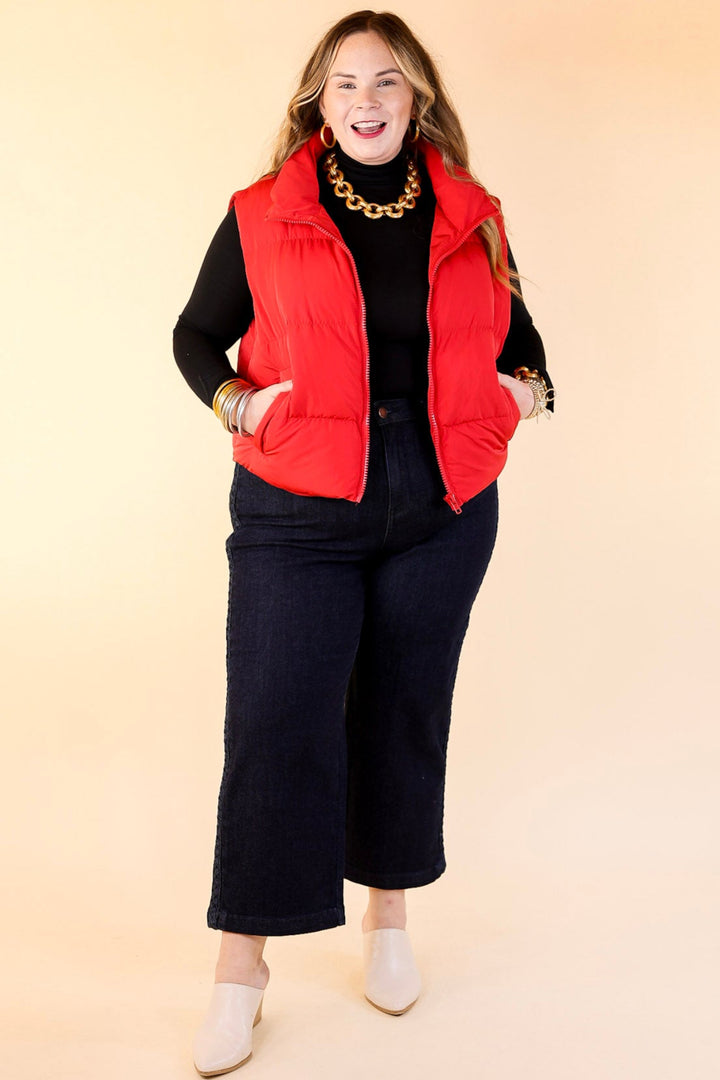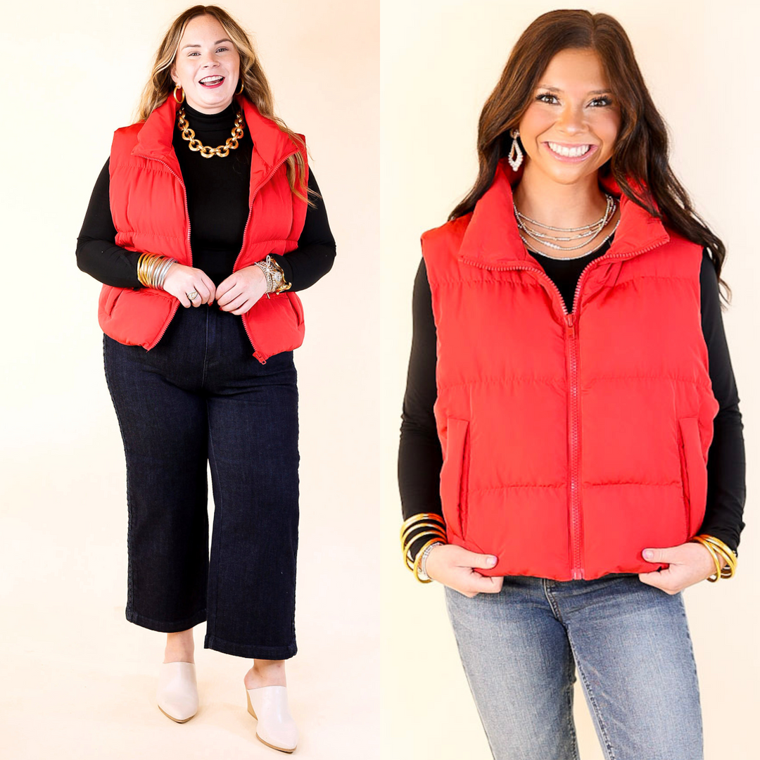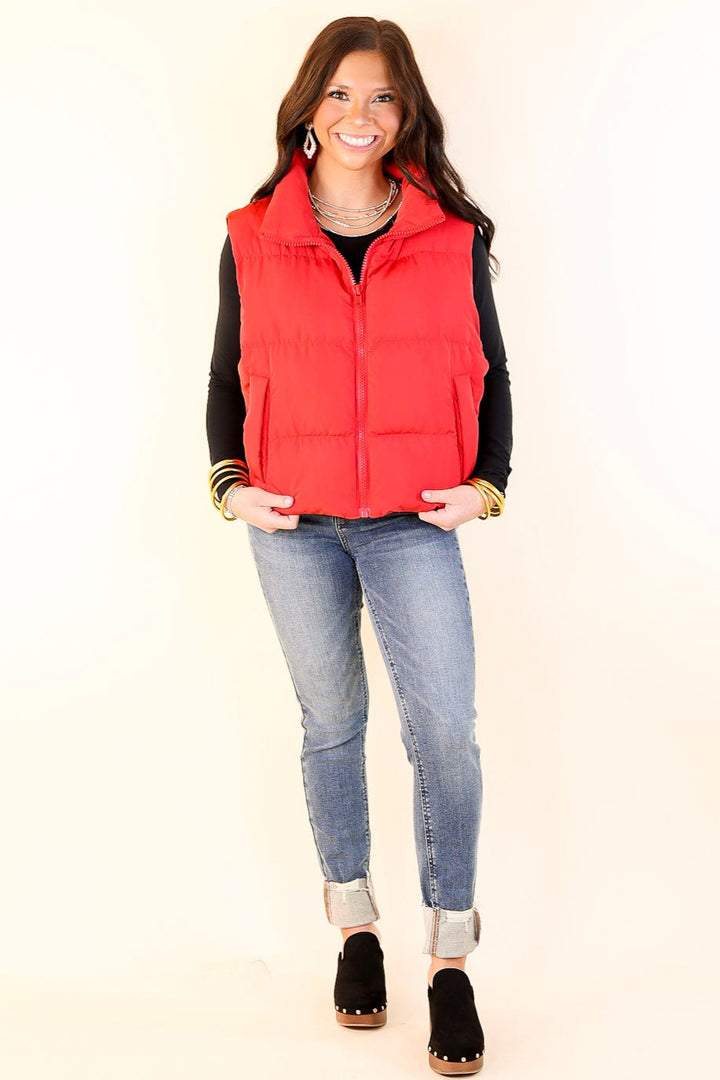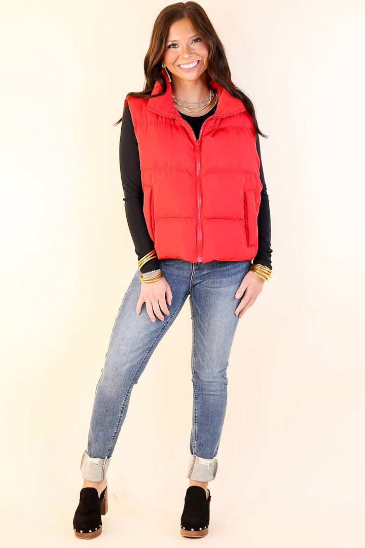 Brave the elements in style with the Whispering Pines Puffer Vest in Red. This eye-catching zip-up vest features red fabric, front pockets, and a high neck for added warmth. Plus, you'll look as stunning as you feel! Enjoy a pop of color and unbeatable comfort in any weather.