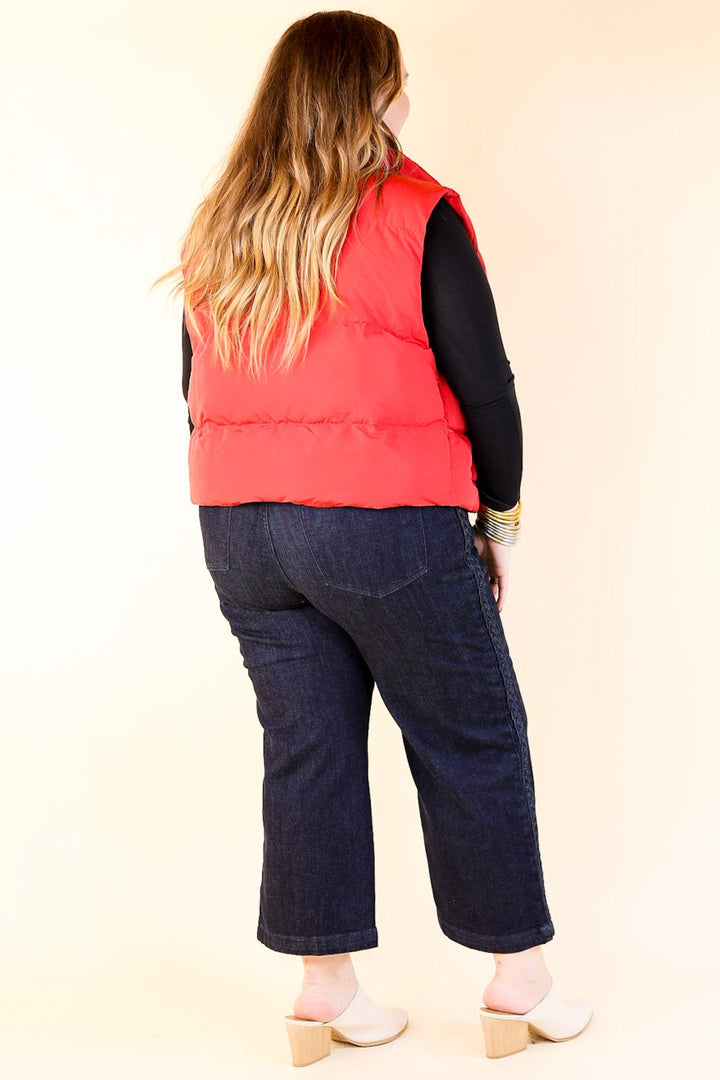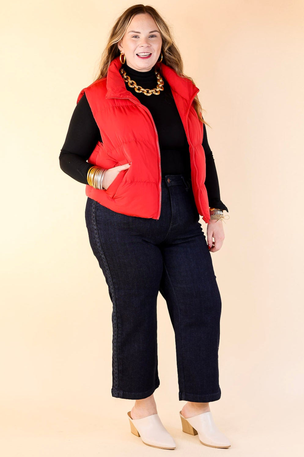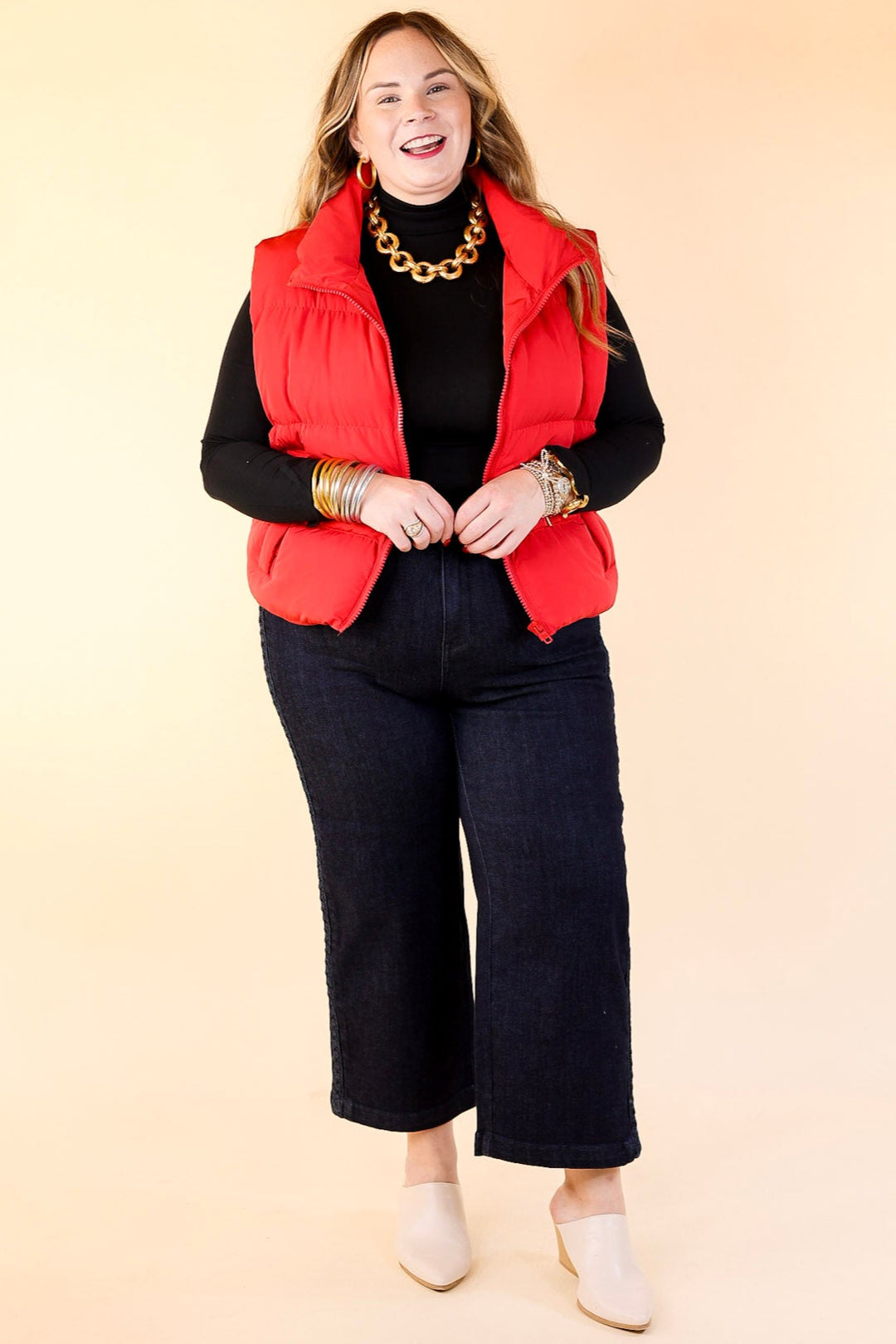 Brave the elements in style with the Whispering Pines Puffer Vest in Red. This eye-catching zip-up vest features red fabric, front pockets, and a high neck for added warmth. Plus, you'll look as stunning as you feel! Enjoy a pop of color and unbeatable comfort in any weather.