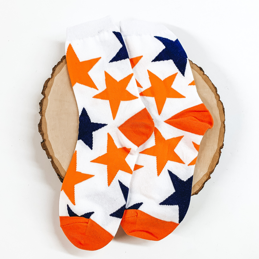 White Ankle Socks with Navy and Orange Star Print