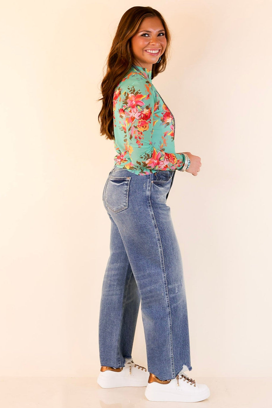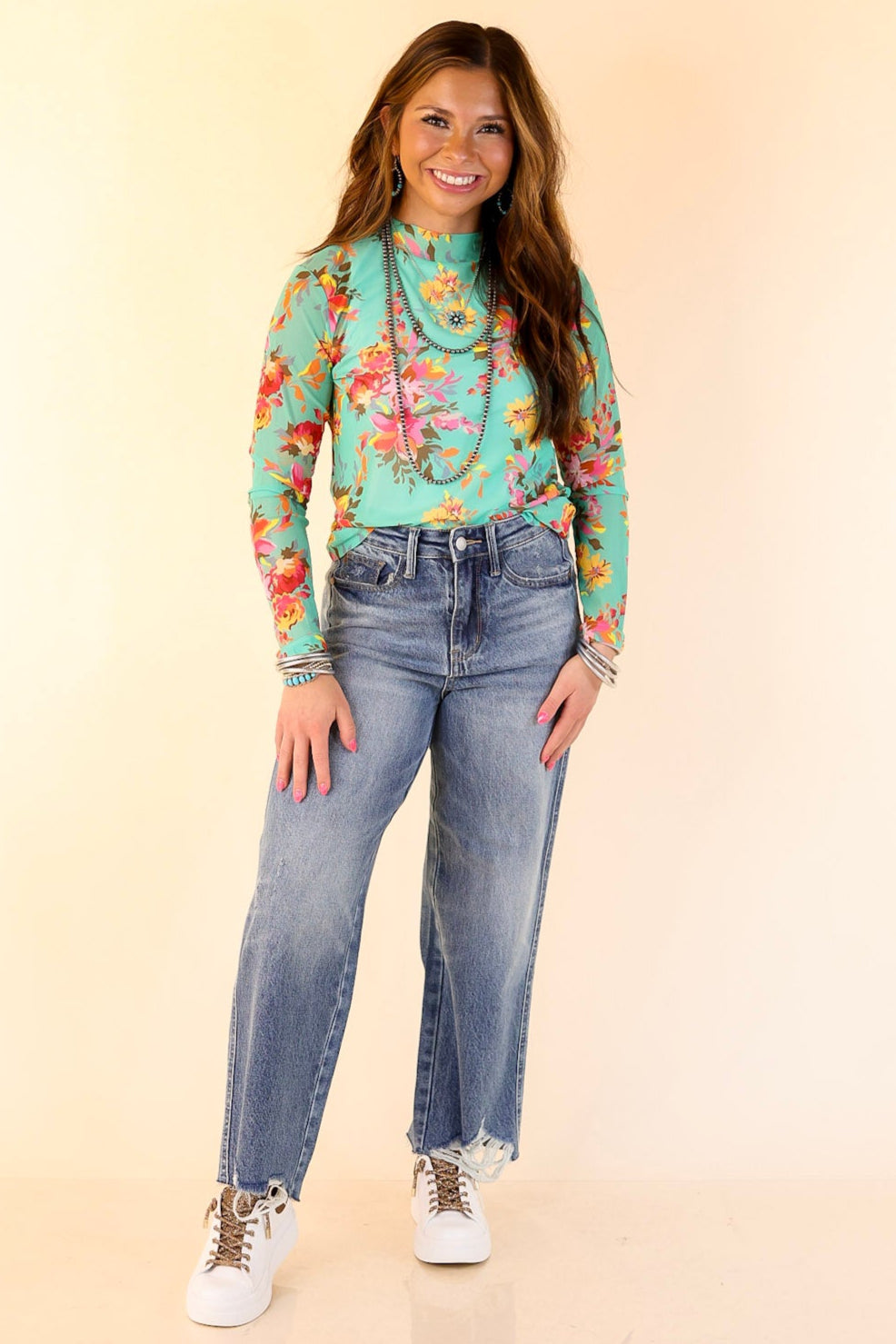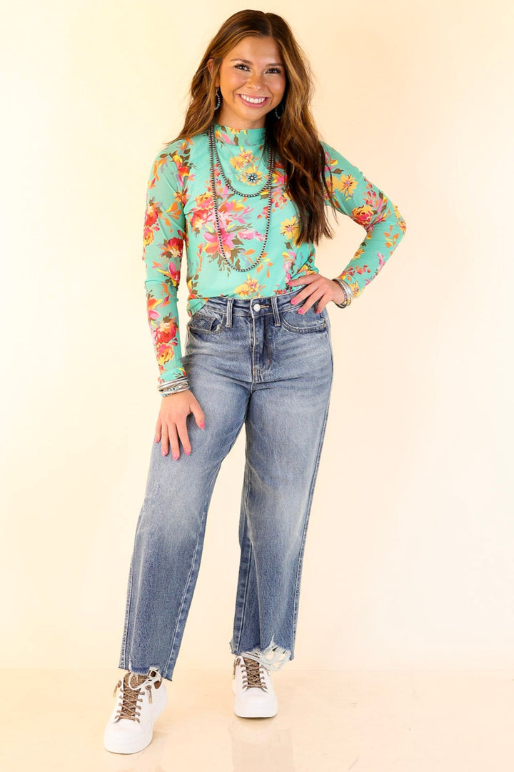 Wildflower Bloom Floral Long Sleeve Mesh Top in Turquoise