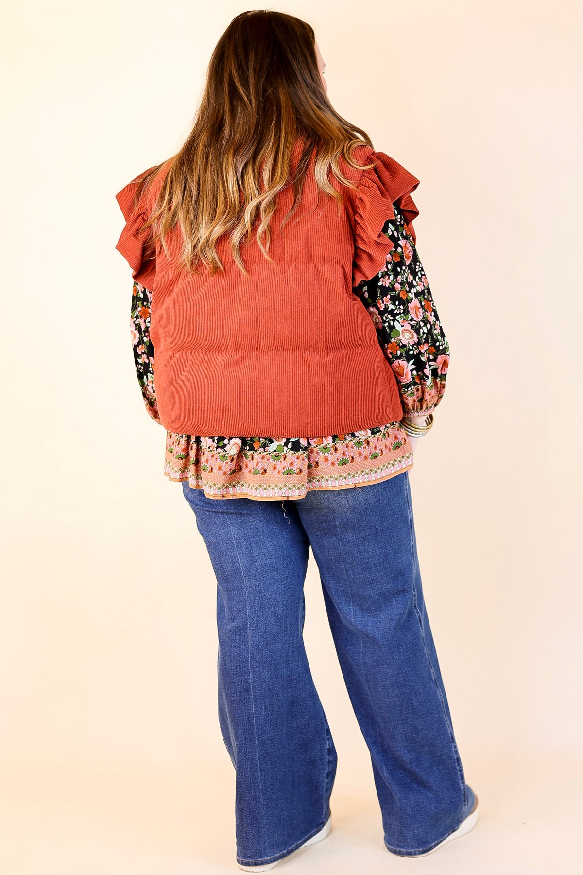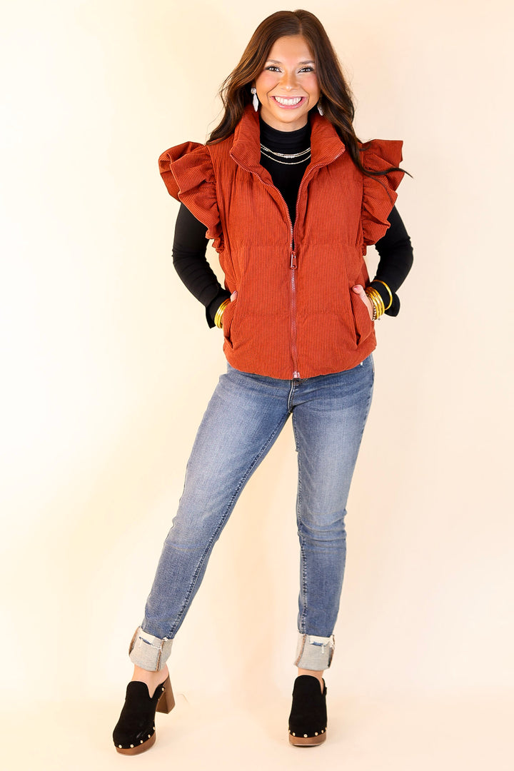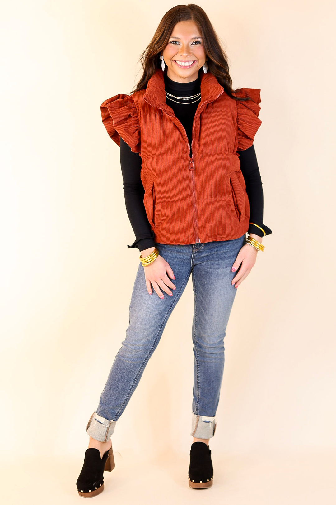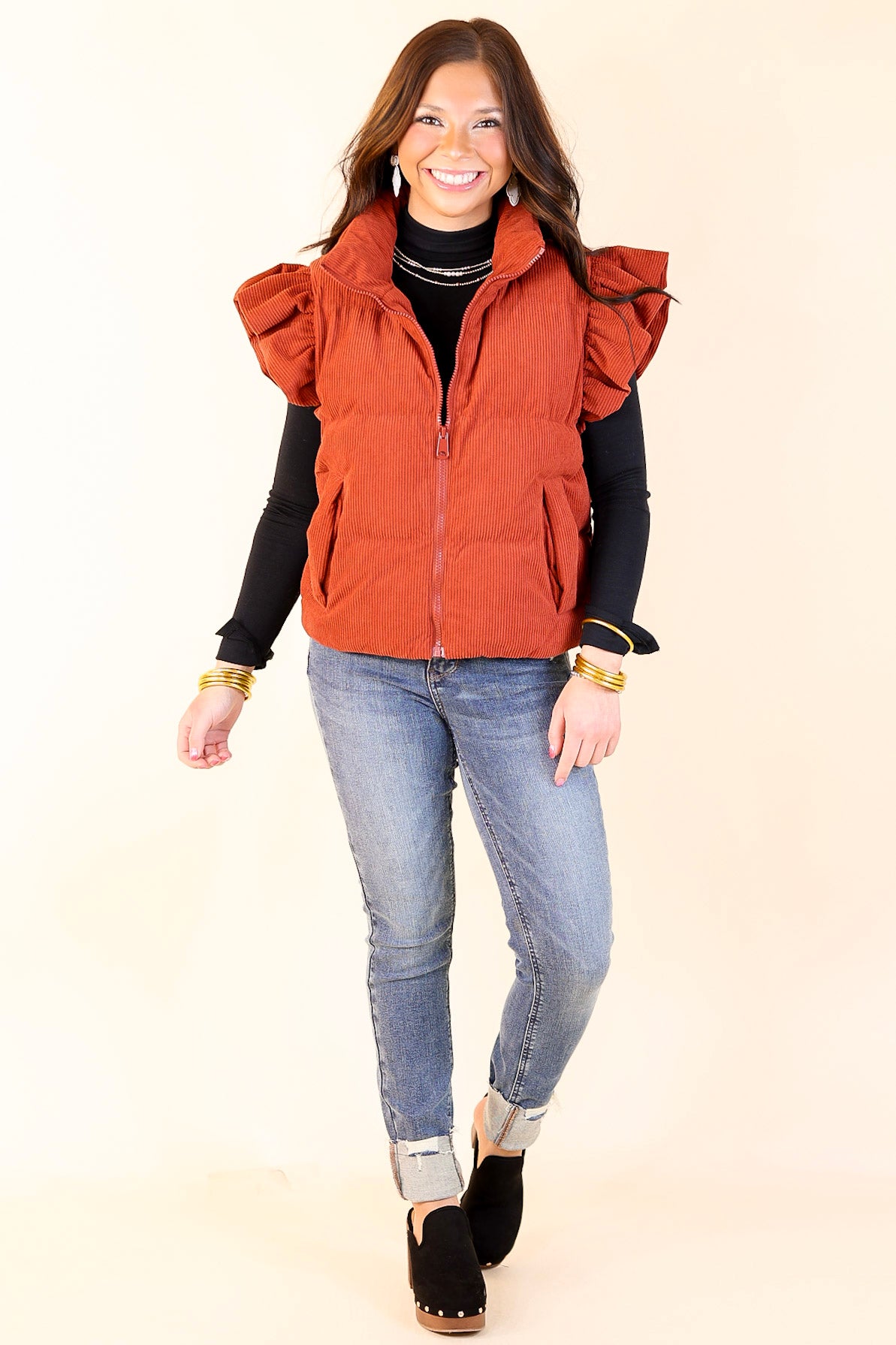 Winter Wanderlust Corduroy Puffer Vest with Ruffle Sleeves in Rust Red