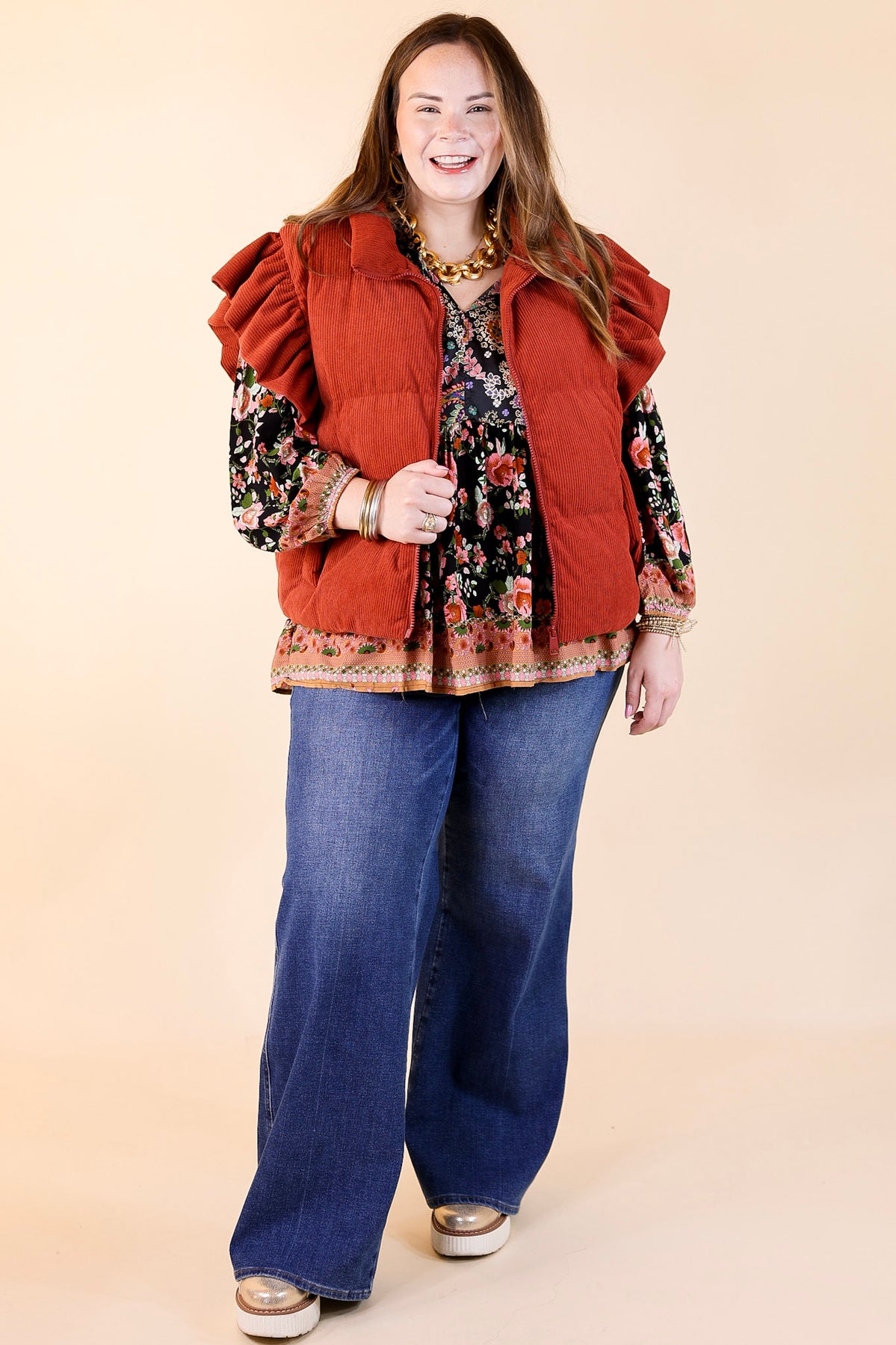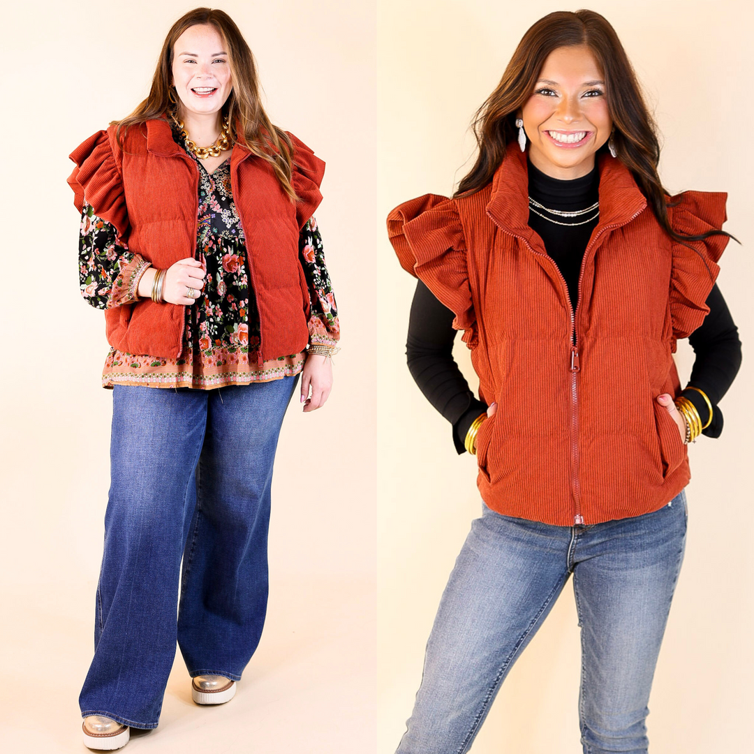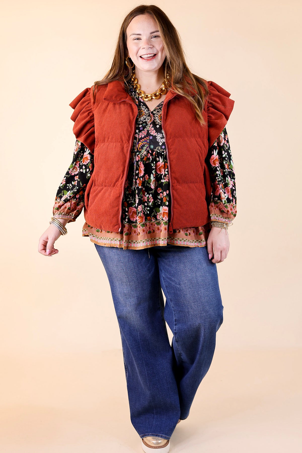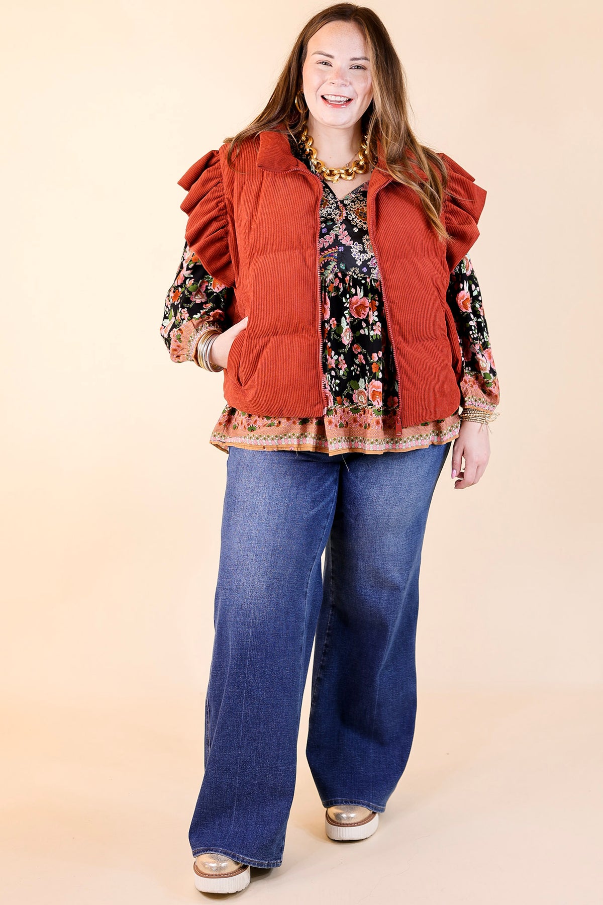 Winter Wanderlust Corduroy Puffer Vest with Ruffle Sleeves in Rust Red