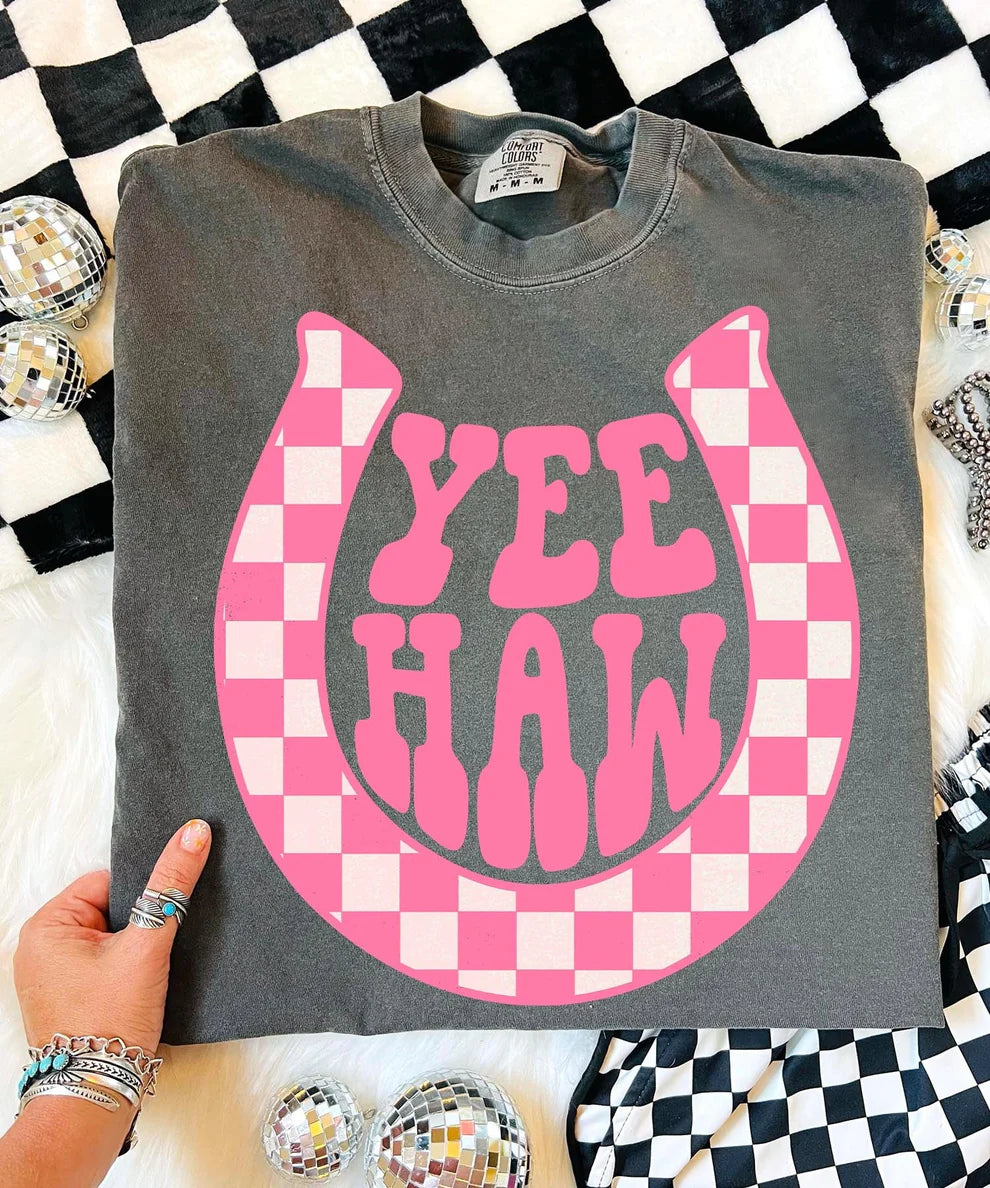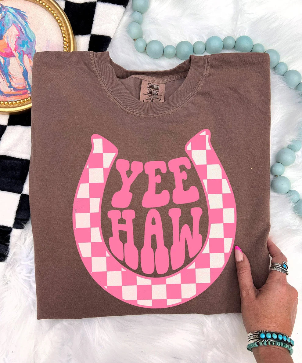 Online Exclusive | Yee Haw Pink Checkered Horseshoe Graphic on Comfort Color Short Sleeve Tee in Multiple Color Options