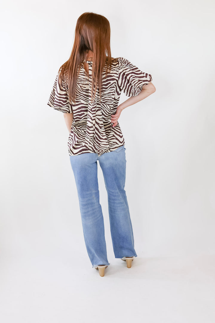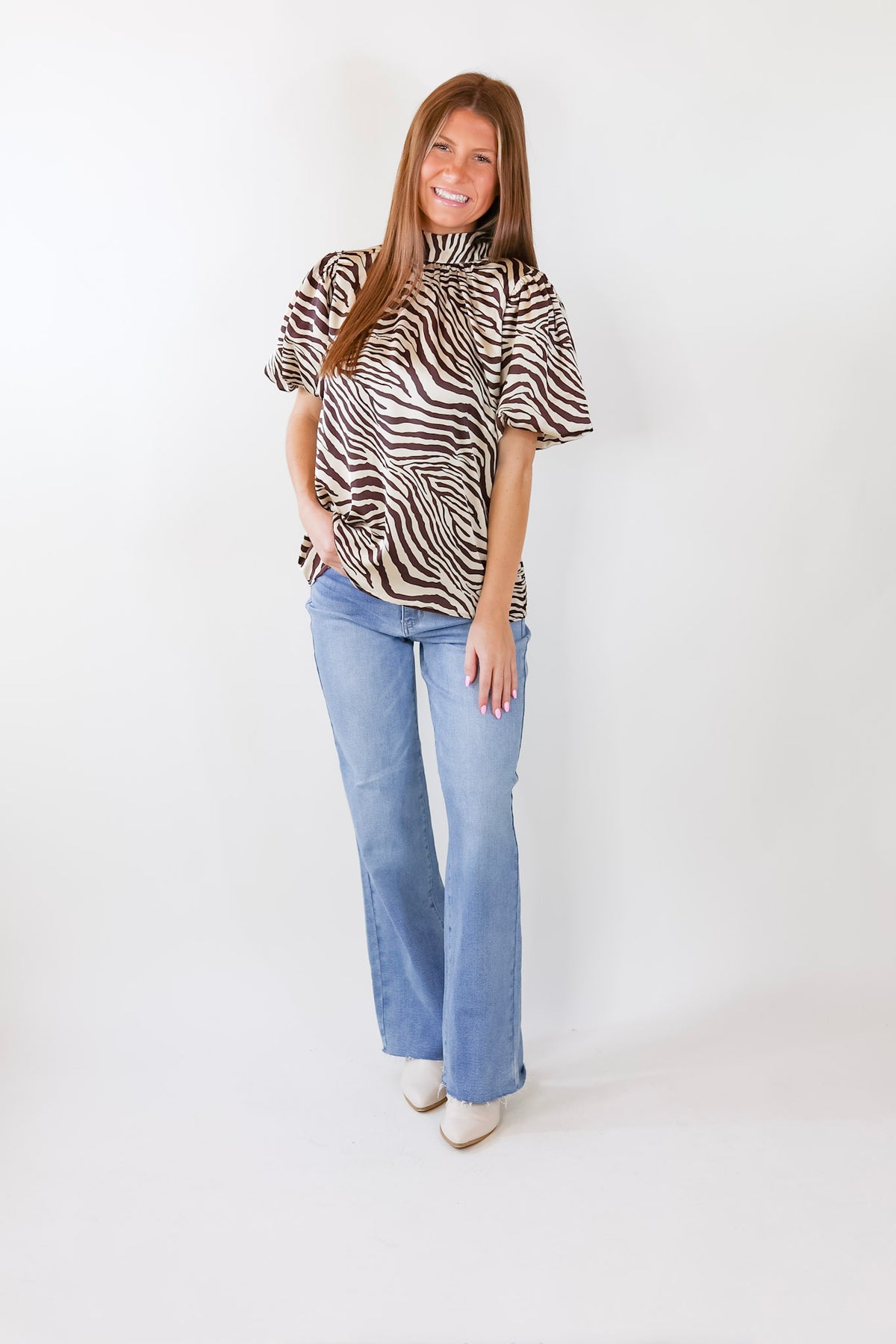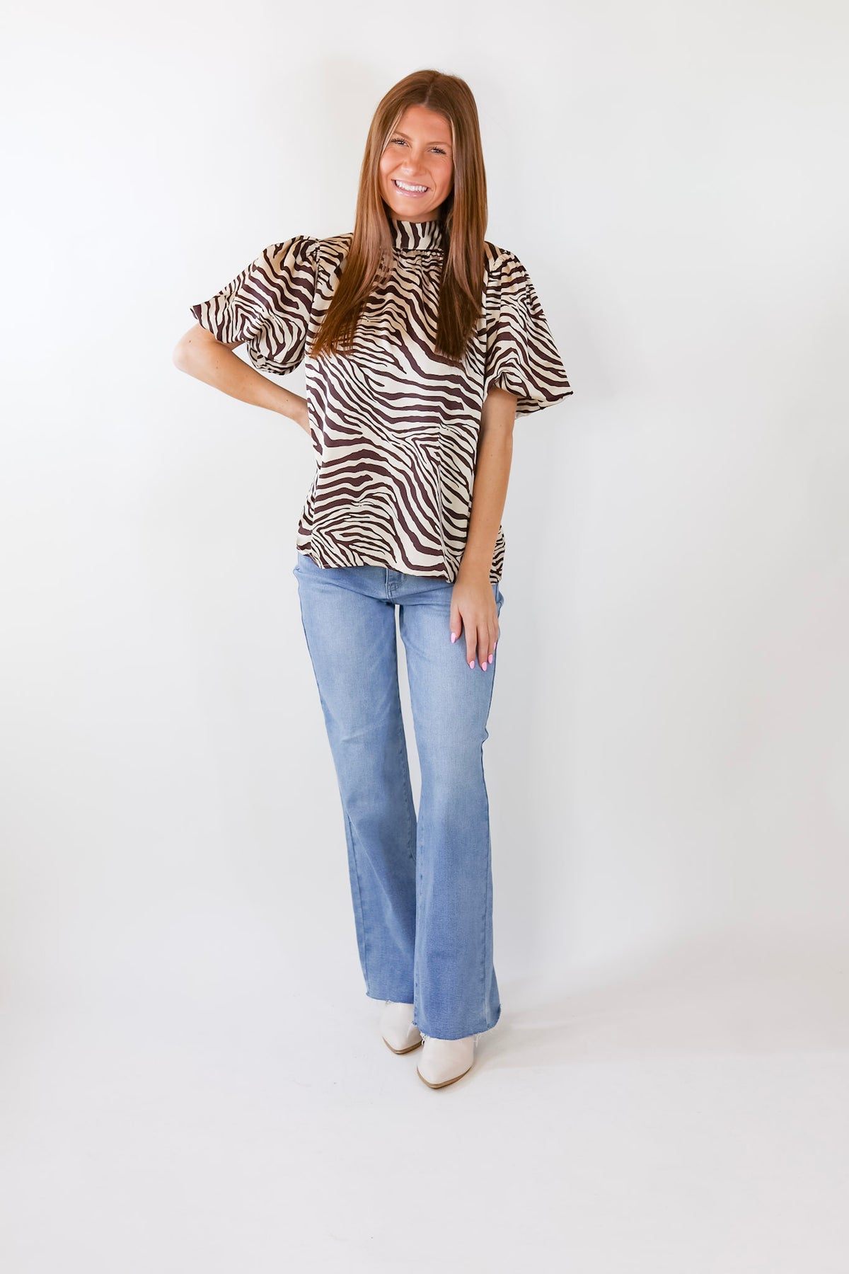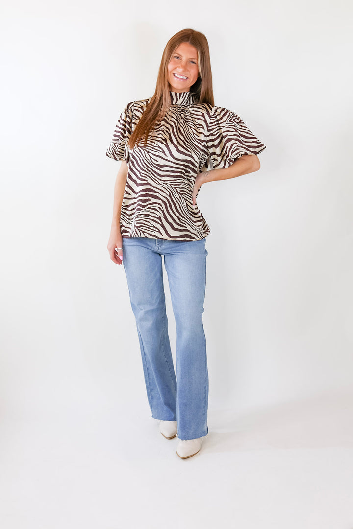 Rival Flair Zebra Print Top with Mock Neck in Chocolate Brown and Cream